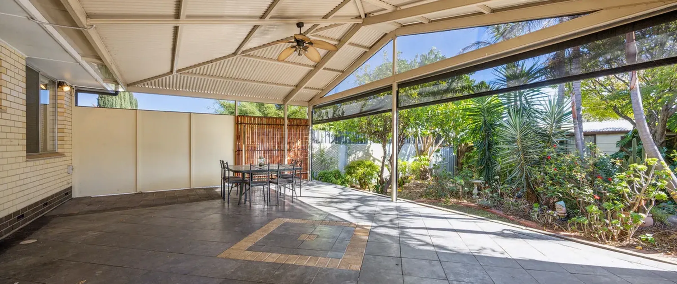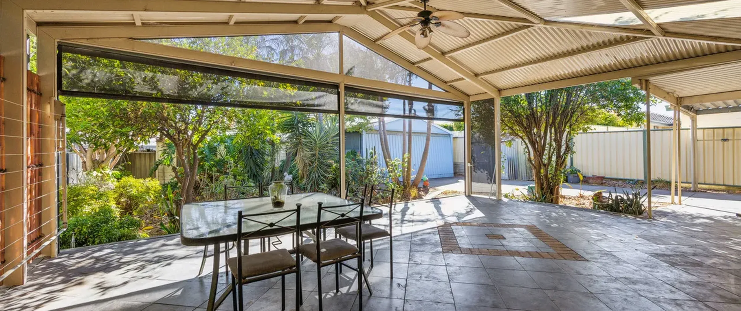 - Expansive outdoor undercover entertaining area with café blinds and ceiling fan