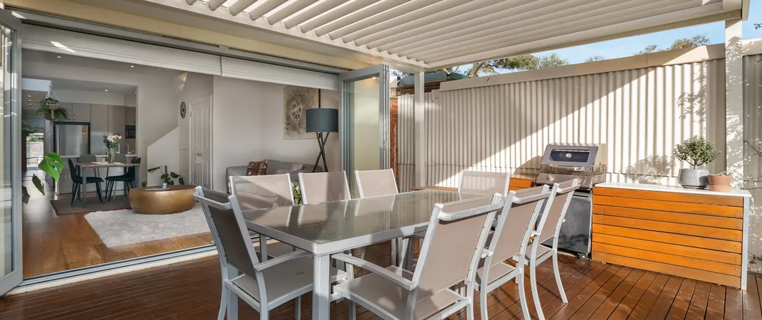Full length glass bi-fold doors provide a seamless transition of indoor living to year-round outdoor entertaining, complete with an all-weather alfresco decking featuring an automatic vergola that opens and closes according to weather conditions.