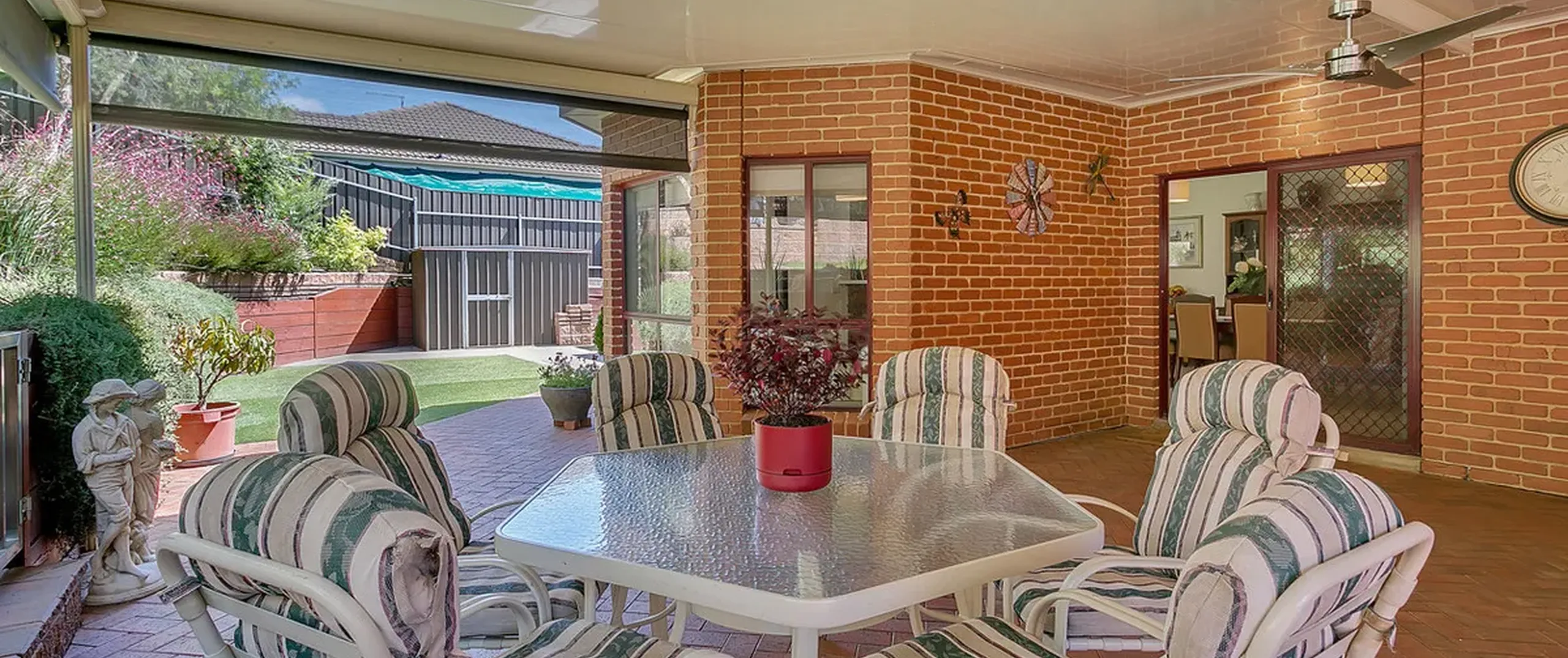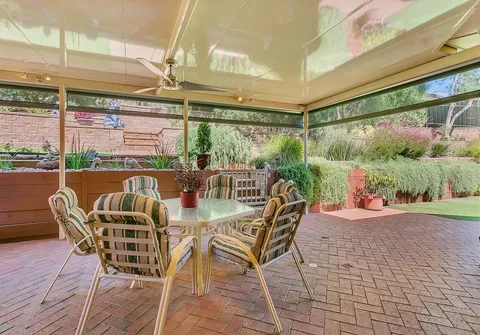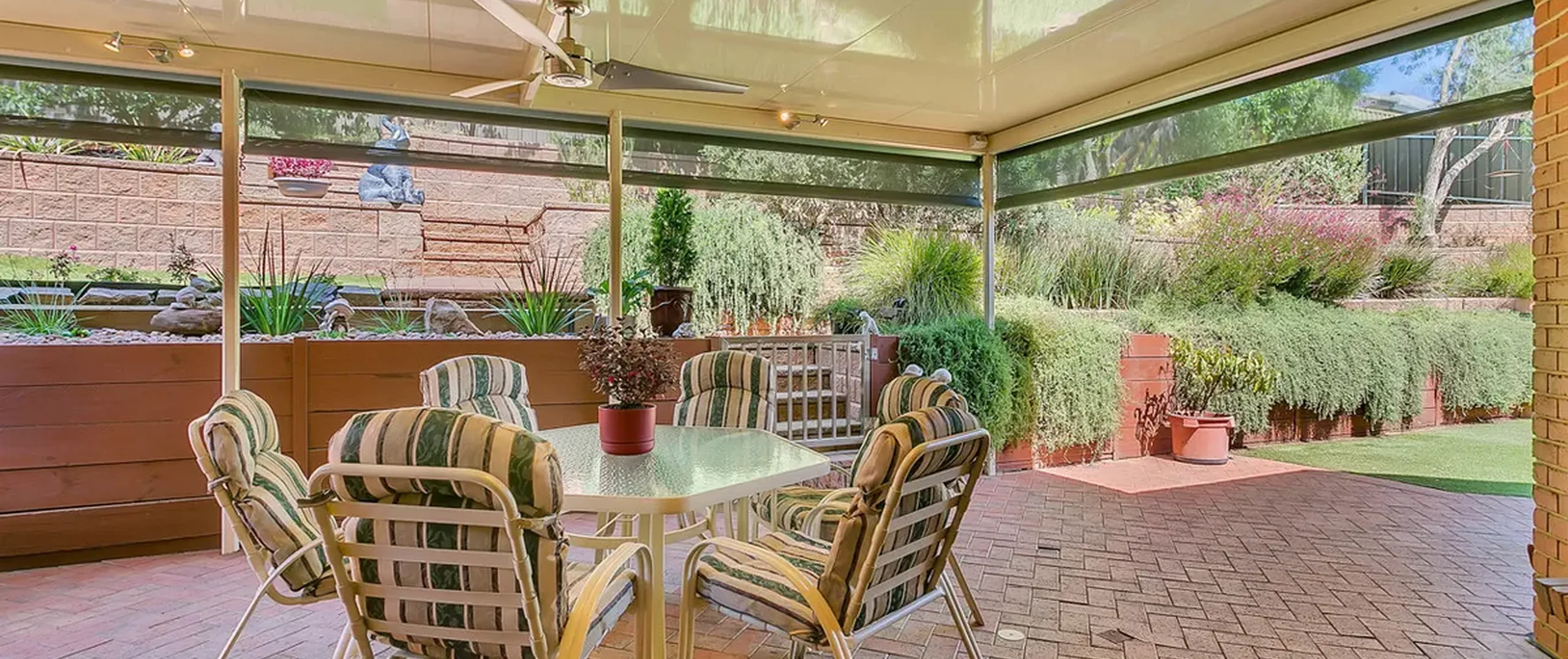 - Quality Patio Style Stratco Outback Verandah featuring 'Cool Deck' Panels and ceiling fans