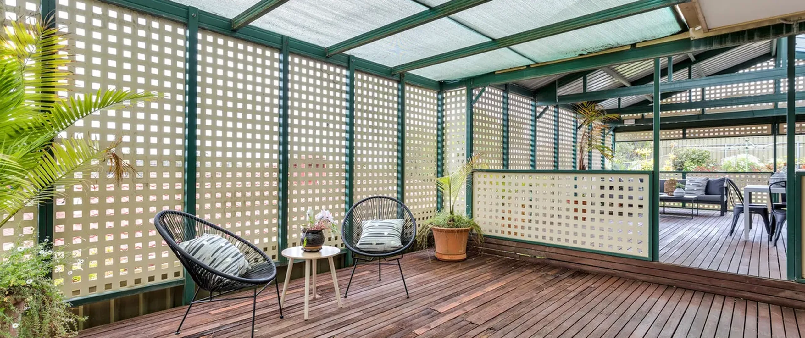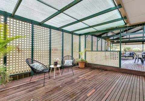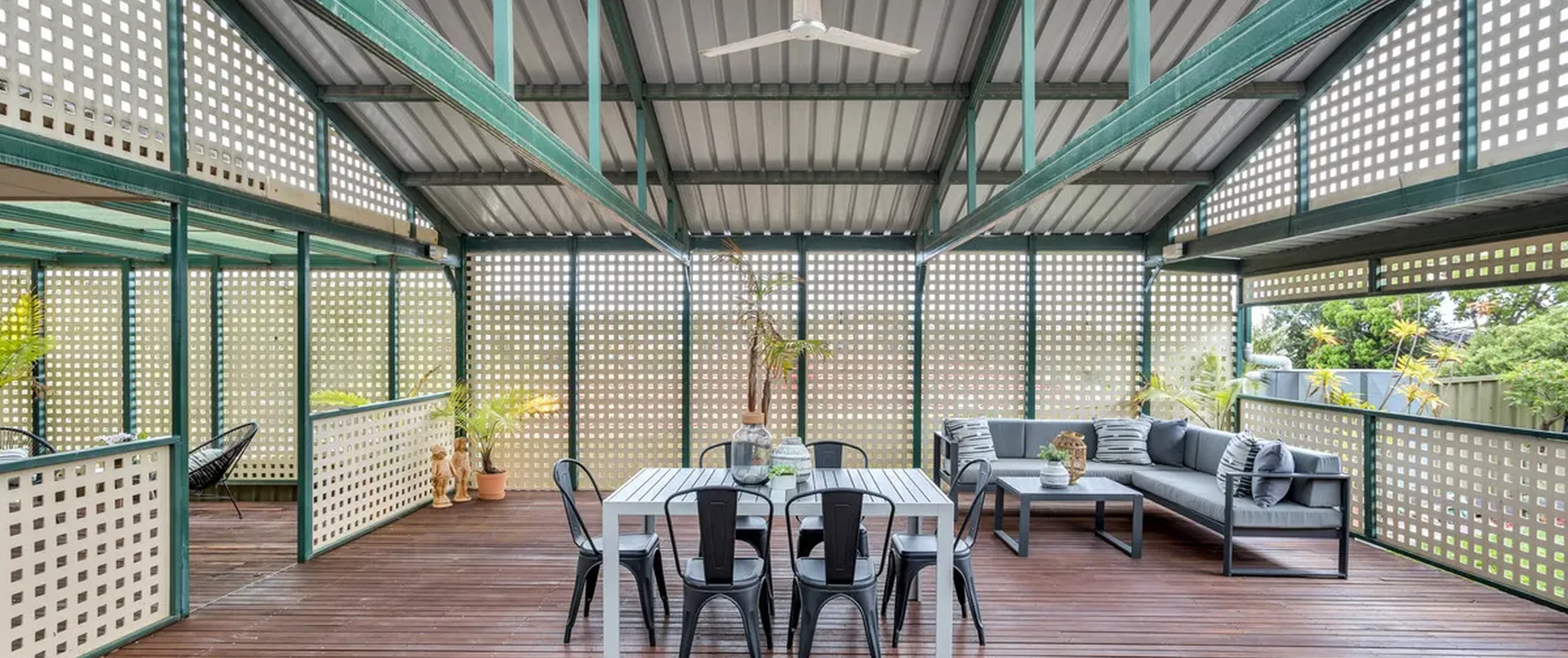 - Huge decked entertaining area with a pitched roof and ceiling fan