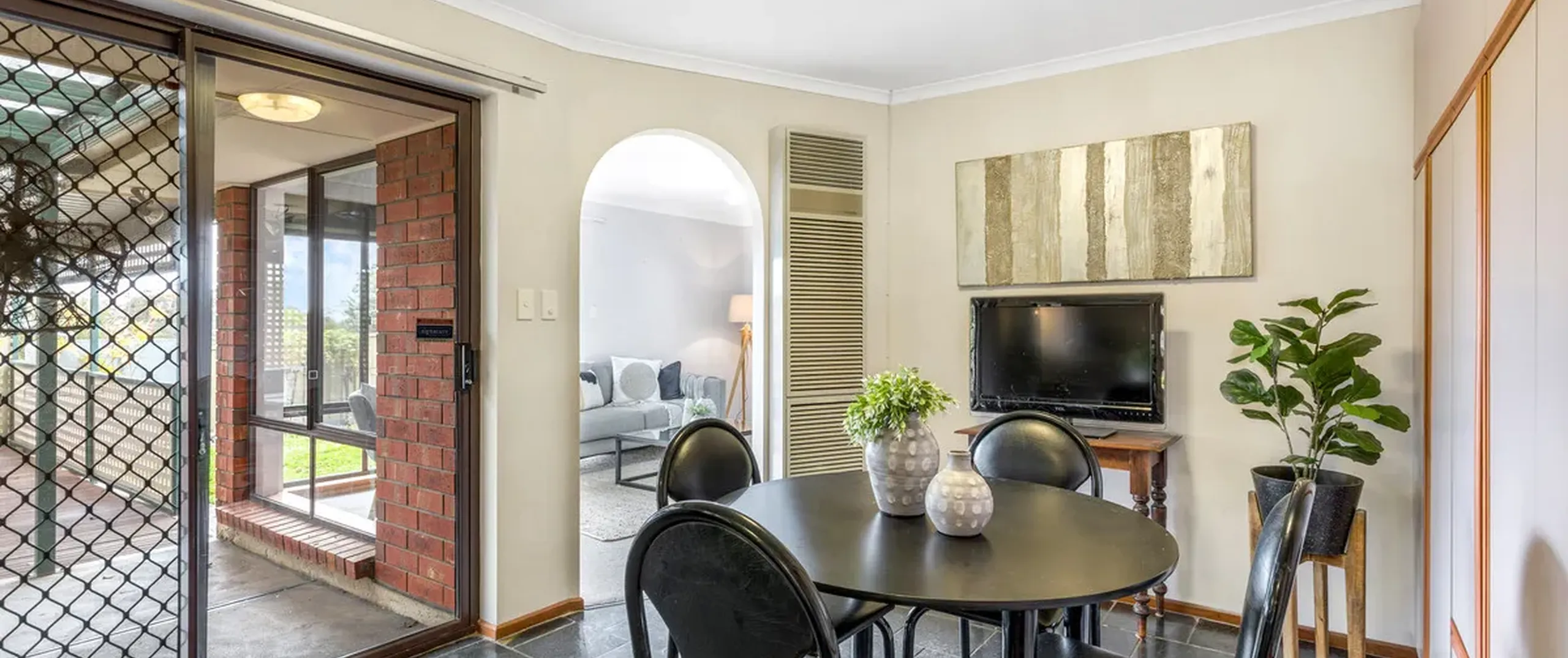 - Meals area adjacent kitchen with heater and large built-in cupboard for storage