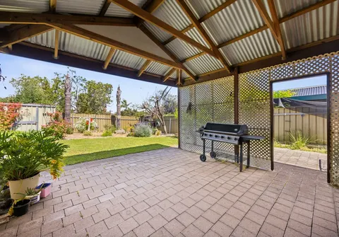 Outside, a large paved verandah flows onto a beautifully maintained rear yard, with space for children and pets to enjoy. A handy shed provides extra storage space, completing this family-friendly property.