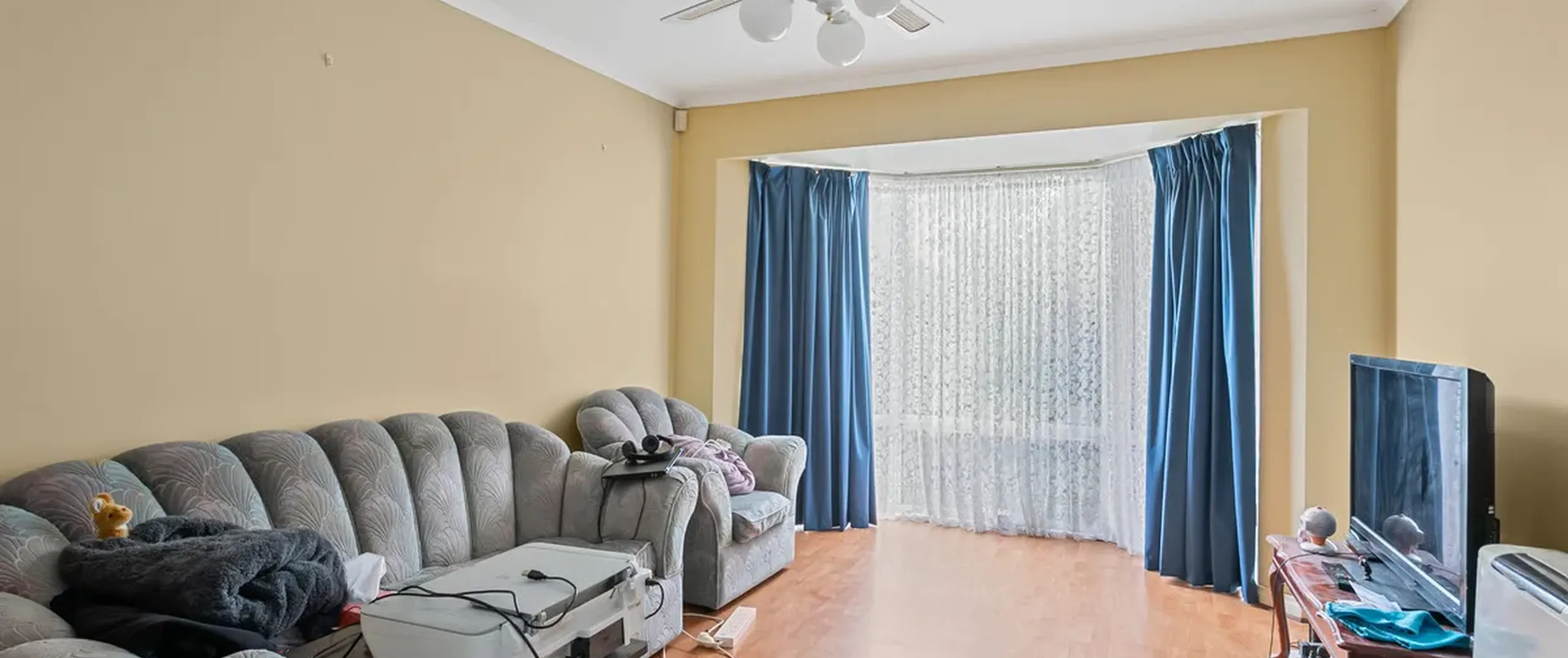 - Large lounge room flooded with natural light from the stunning bay window, complete with ceiling fan and heater