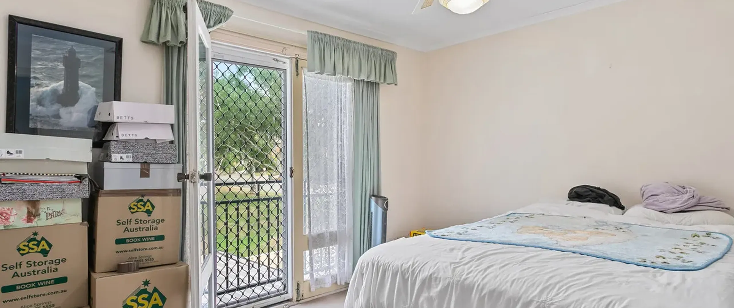 - Master bedroom with built-in robe, Juliette balcony and ceiling fan