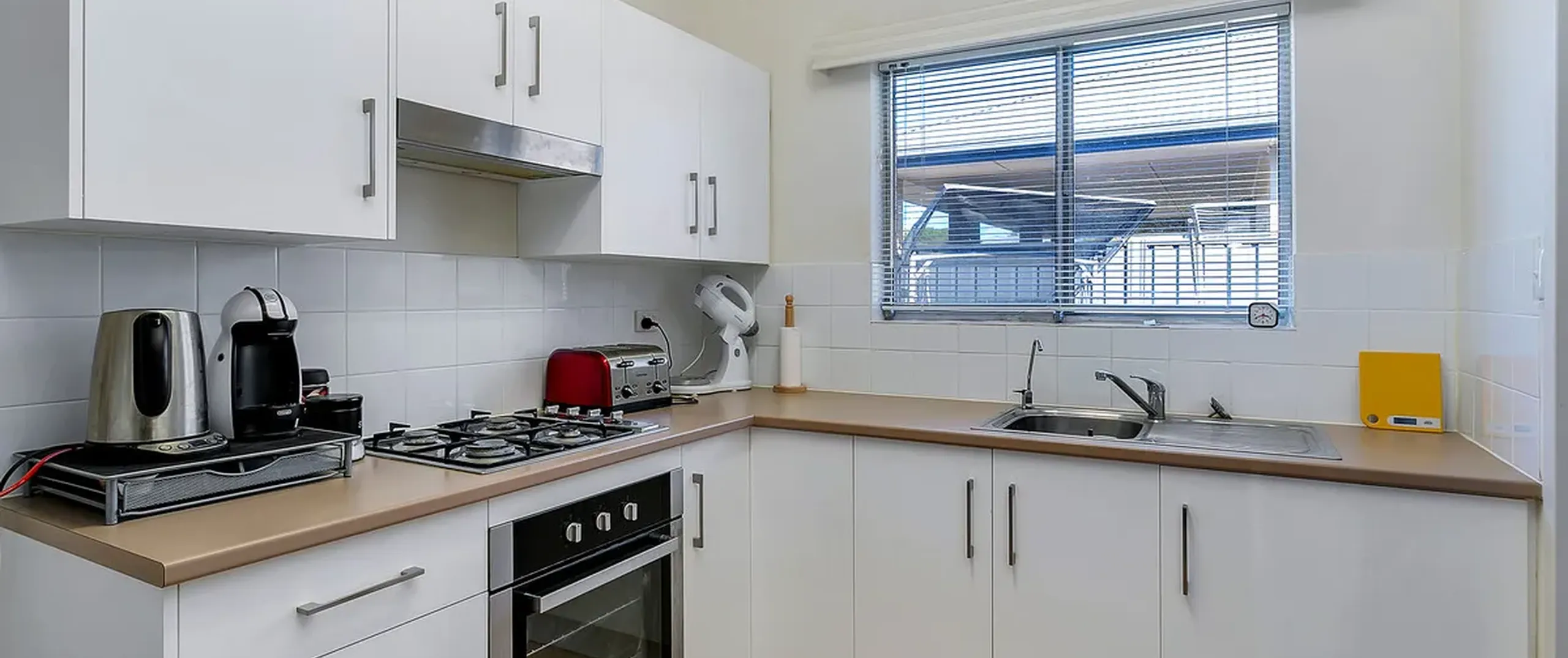 - Functional kitchen with stainless steel gas cooktop and oven complete with ample cupboard space