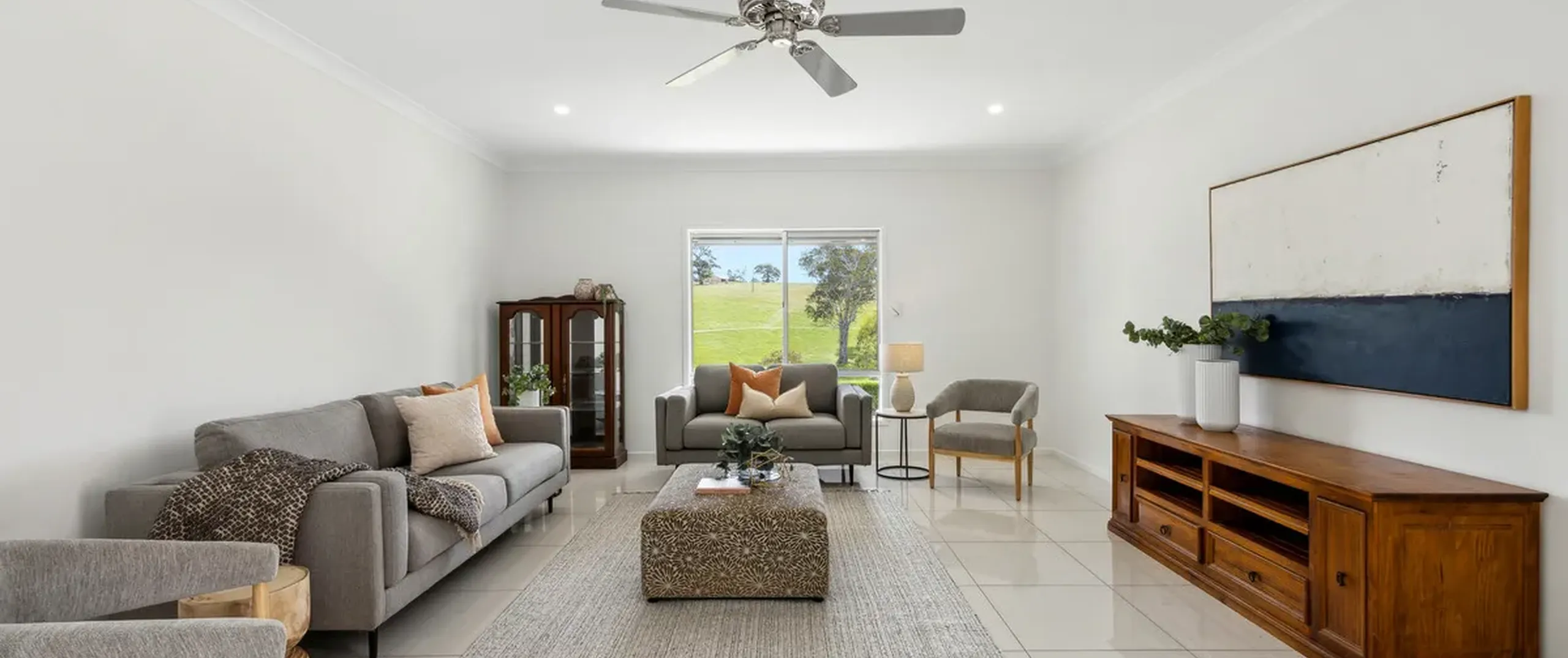 - Formal family room with ceiling fan and dual doors leading to the verandah