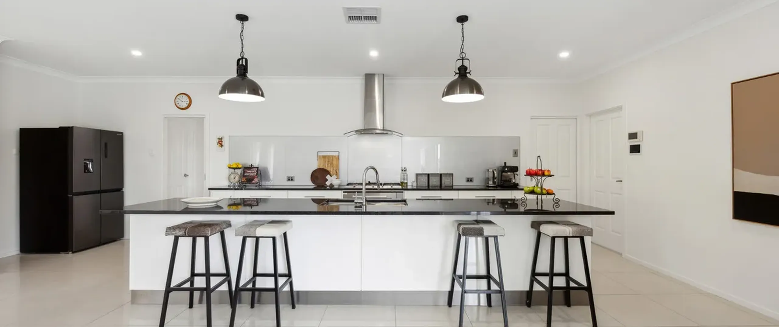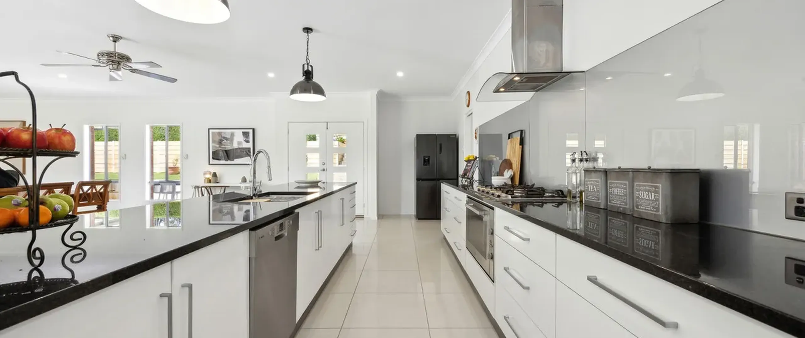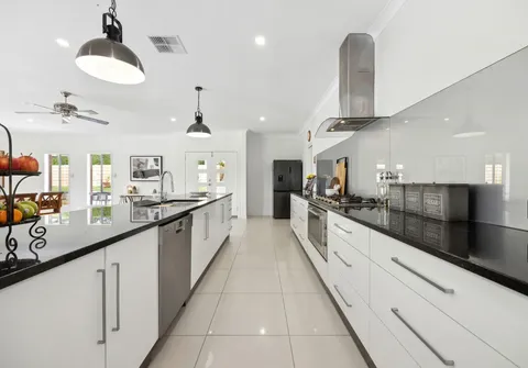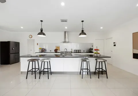 - Large, modern kitchen featuring stainless steel appliances including 90cm gas cooktop, Bosch dishwasher and electric 90cm oven, butler’s pantry, breakfast bar, stone benches, and ample cupboard space