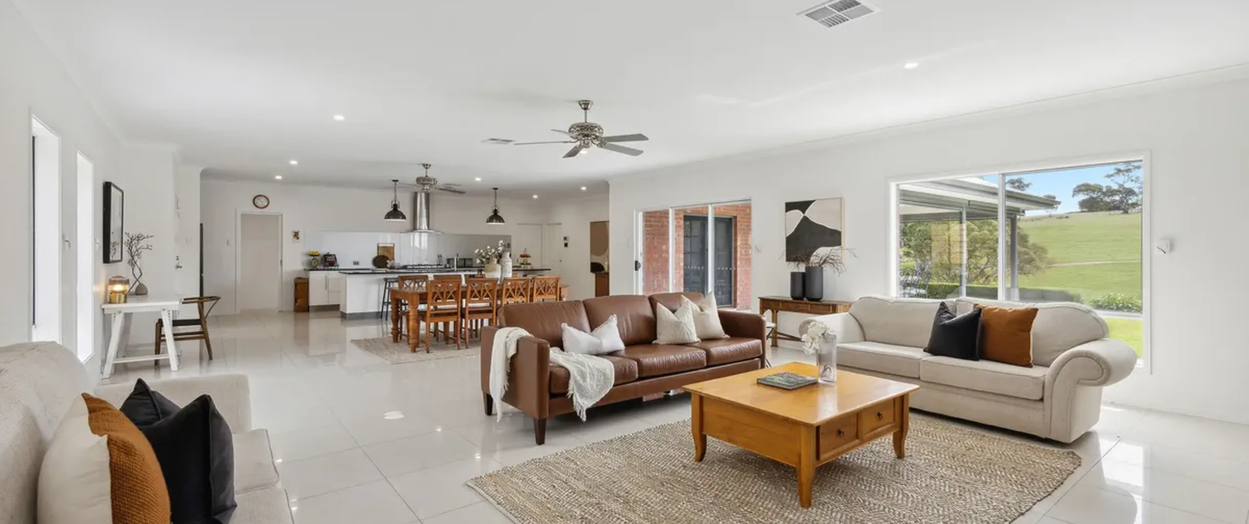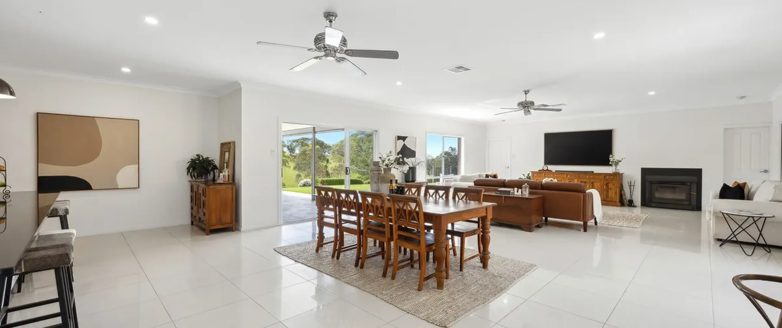 - Divine, open plan living, dining and kitchen area with ceiling fans and cosy wood fireplace