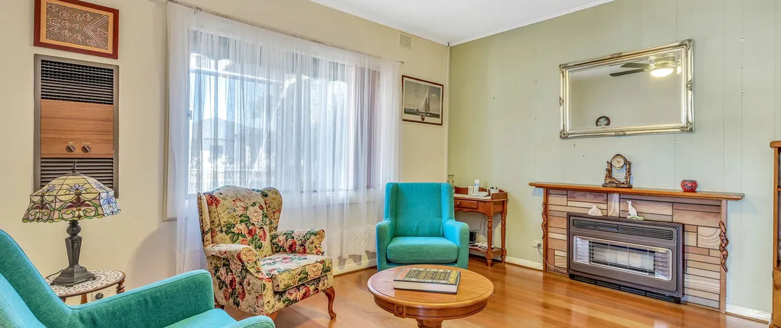 - Formal lounge room with stunning floorboards, ceiling fan, gas heater and wall air conditioner