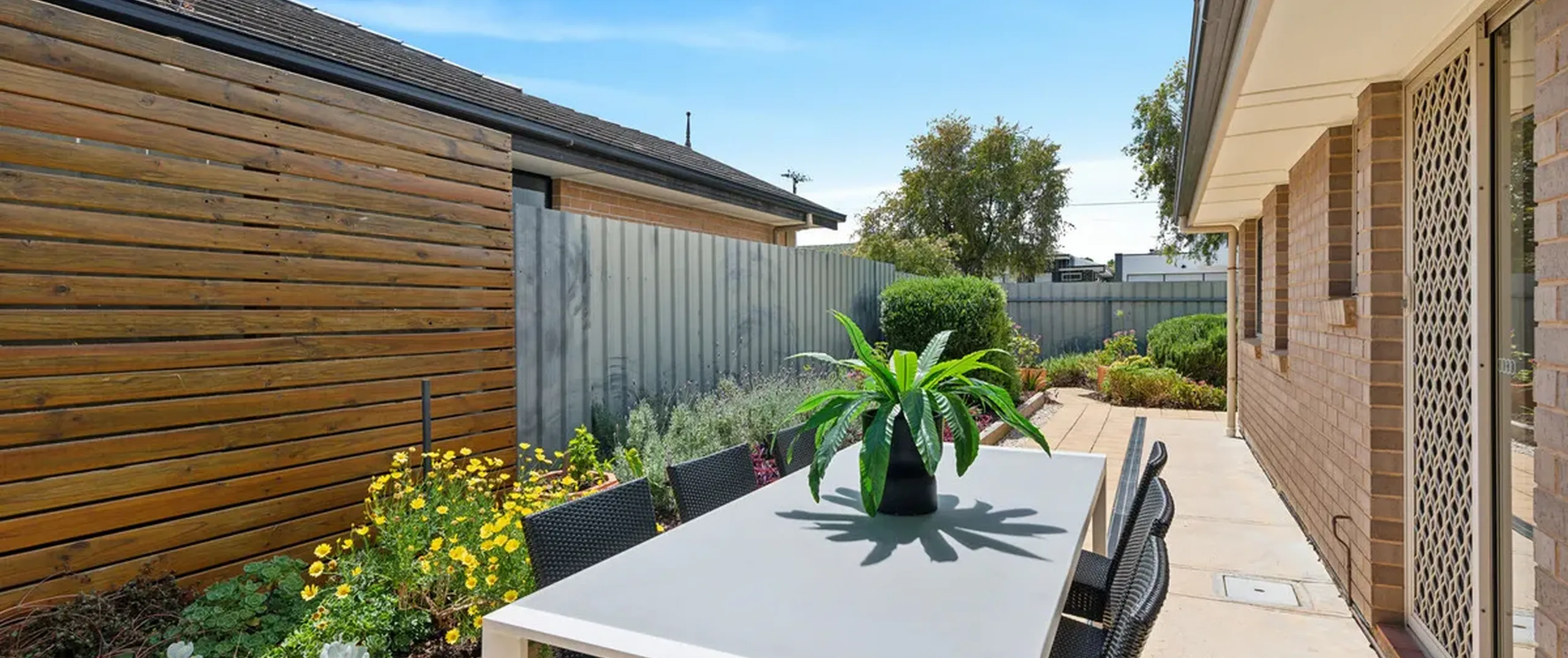 - Paved rear garden with low maintenance landscape which includes a raised garden bed, an ideal spot to get some sunshine and enjoy your morning coffee.