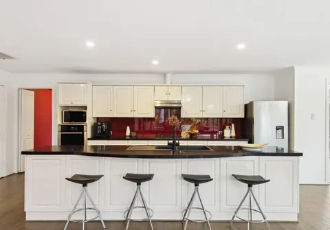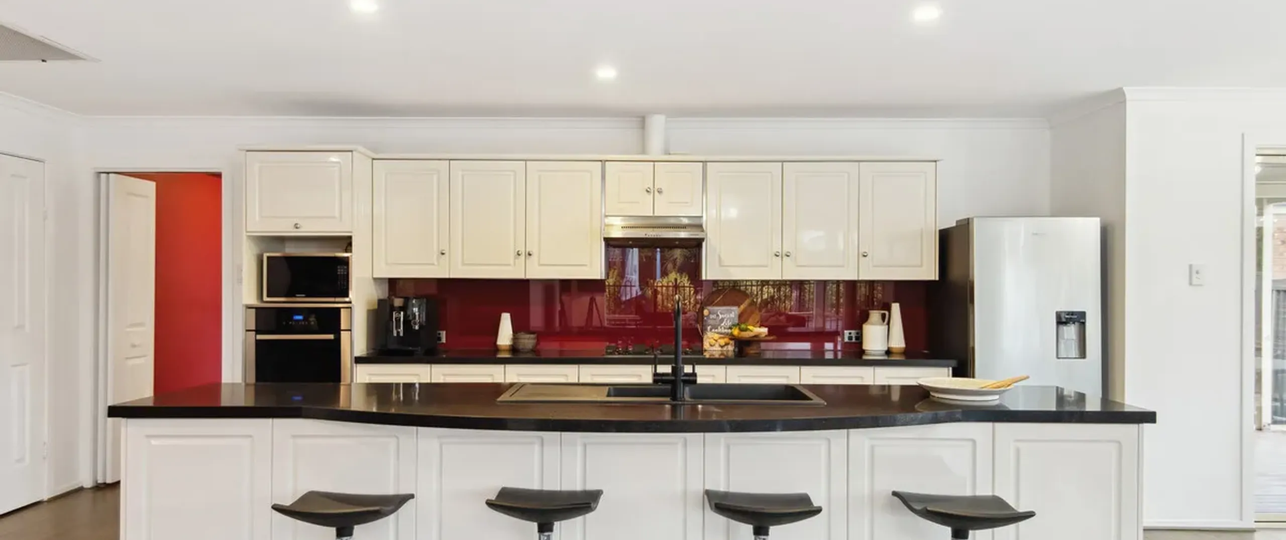 - Kitchen boasts a large island breakfast bar with quality matte black hardware, gas cooktop, dishwasher and large pantry