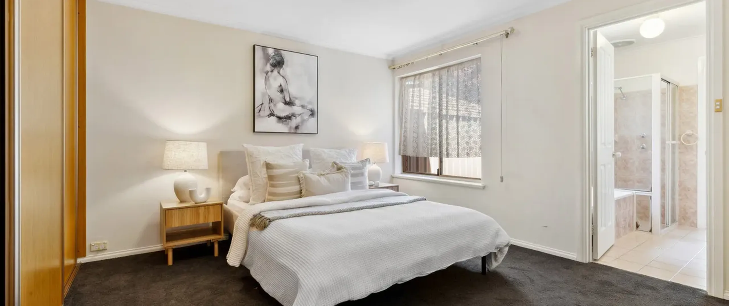 - Spacious main bedroom with lush carpet, a built-in robe and convenient direct access to the bathroom