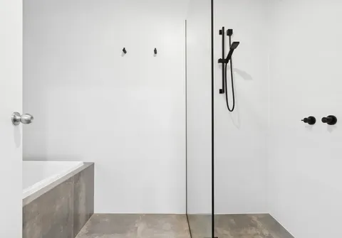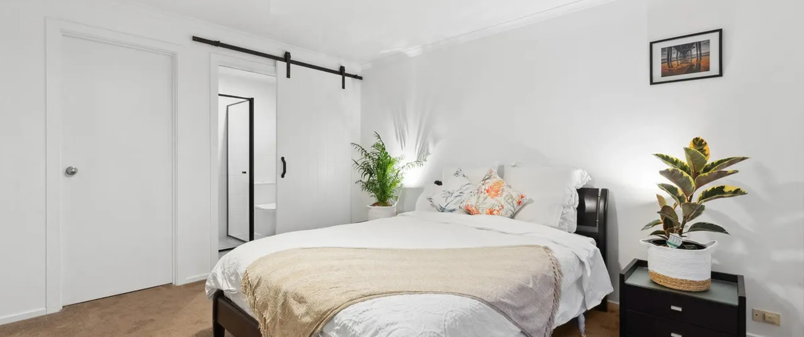 - Large master bedroom with ceiling fan, built-in robe, walk-in robe and modern ensuite complete with floor-to-ceiling tiles, wall-hung vanity, and on-trend matte black tapware