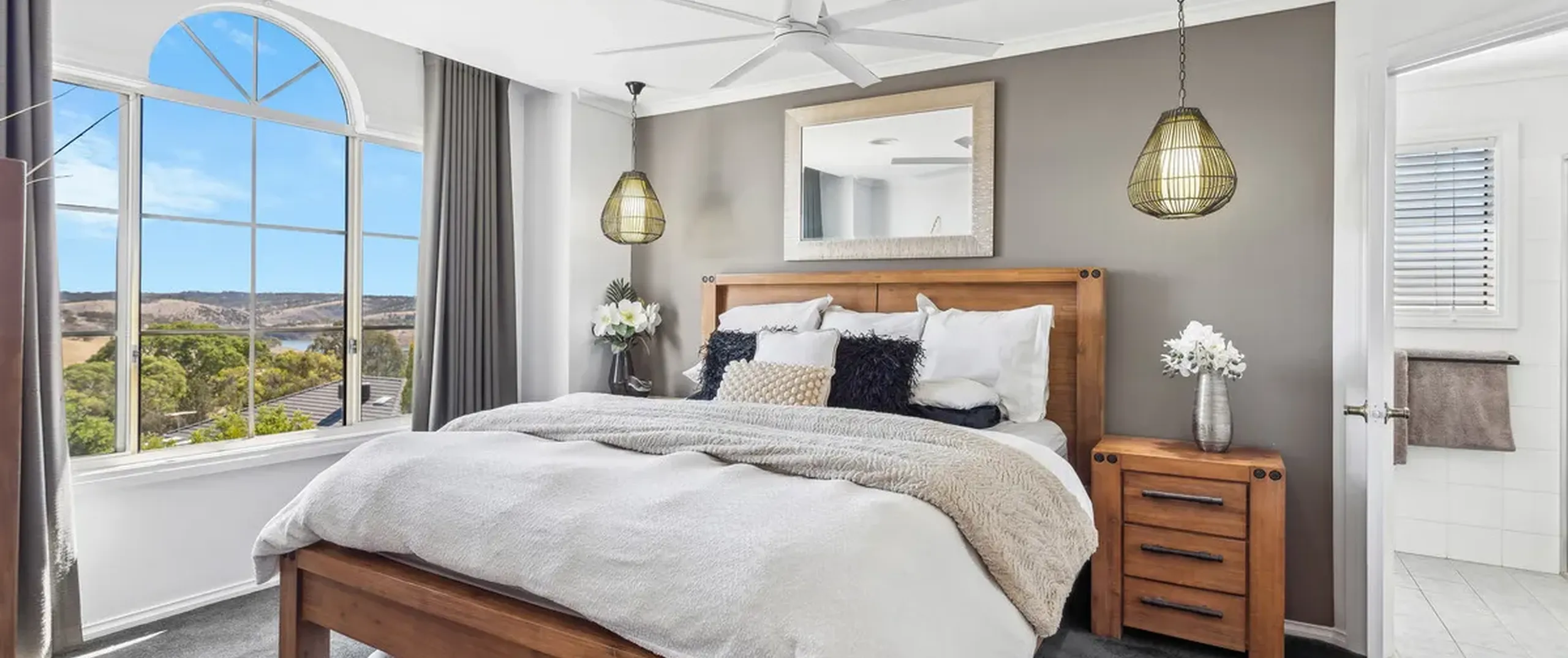 - Master bedroom featuring a charming window with beautiful reserve views, a ceiling fan, walk-in robe, and ensuite