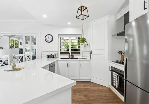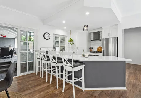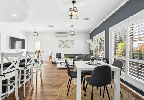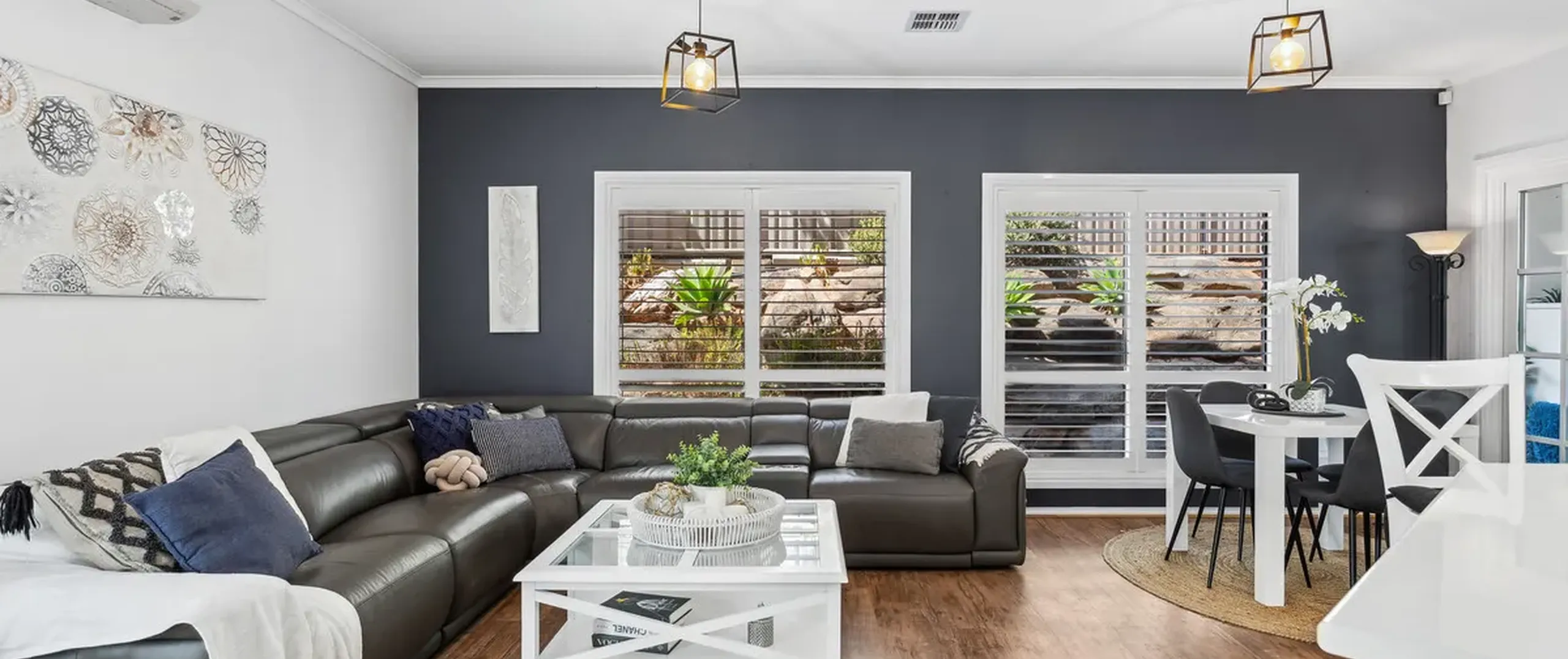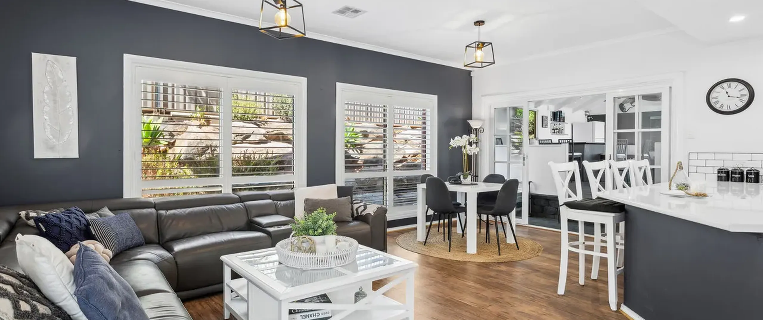 - Light-filled kitchen, living, and dining area with plantation shutters, feature lighting, and beautifully painted grey feature walls adding warmth to the space