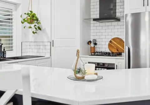 - Modern, crisp white kitchen with stainless steel appliances, sweeping benchtops, on-trend subway tile backsplash, gas cooktop, dishwasher, and walk-in pantry