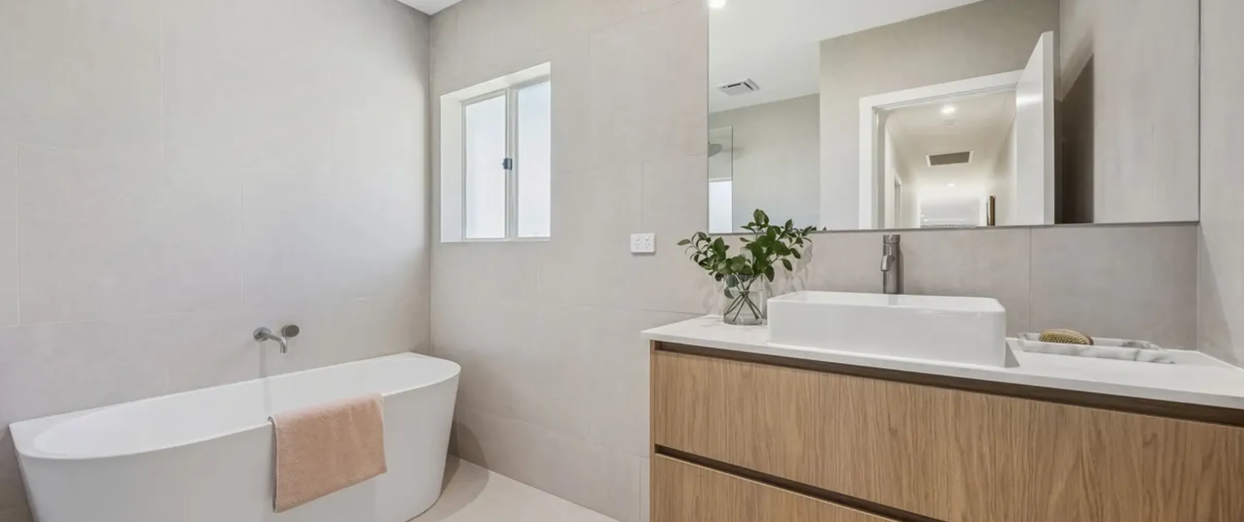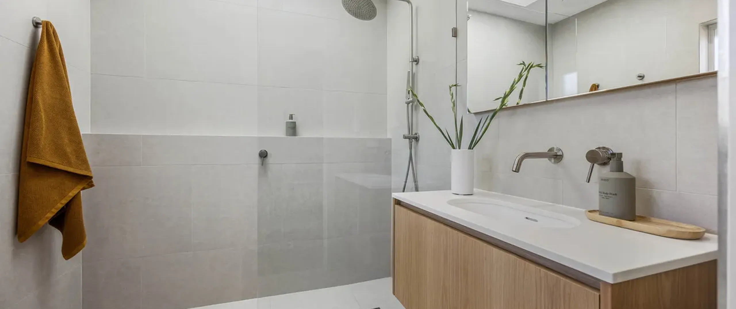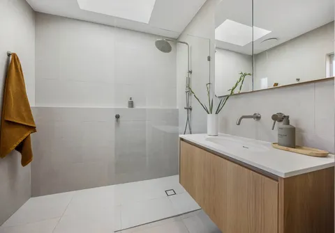 - Large format floor to ceiling tiles in both bathrooms