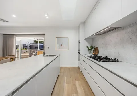 The heart of the home is a breathtaking Carrara marble kitchen featuring integrated Bosch appliances, two pyrolytic ovens, a 5-burner gas cooktop, under-mount sink, skylight, and butler’s pantry. A spacious open-plan meals and family area flows effortlessly to a separate lounge and dining room, offering versatility for both relaxed family living and sophisticated entertaining.