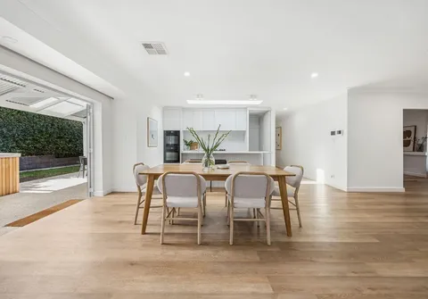 The master suite impresses with a walk-in robe, ceiling fan, and private ensuite with skylight, shower shelf, rain showerhead and frameless shower. Three further bedrooms each include built-in robes and ceiling fans, while the main bathroom and laundry have been newly updated with modern finishes. High ceilings, hybrid flooring, linen sheer curtains, downlights, and ducted reverse-cycle air conditioning enhance the sense of space and comfort throughout.