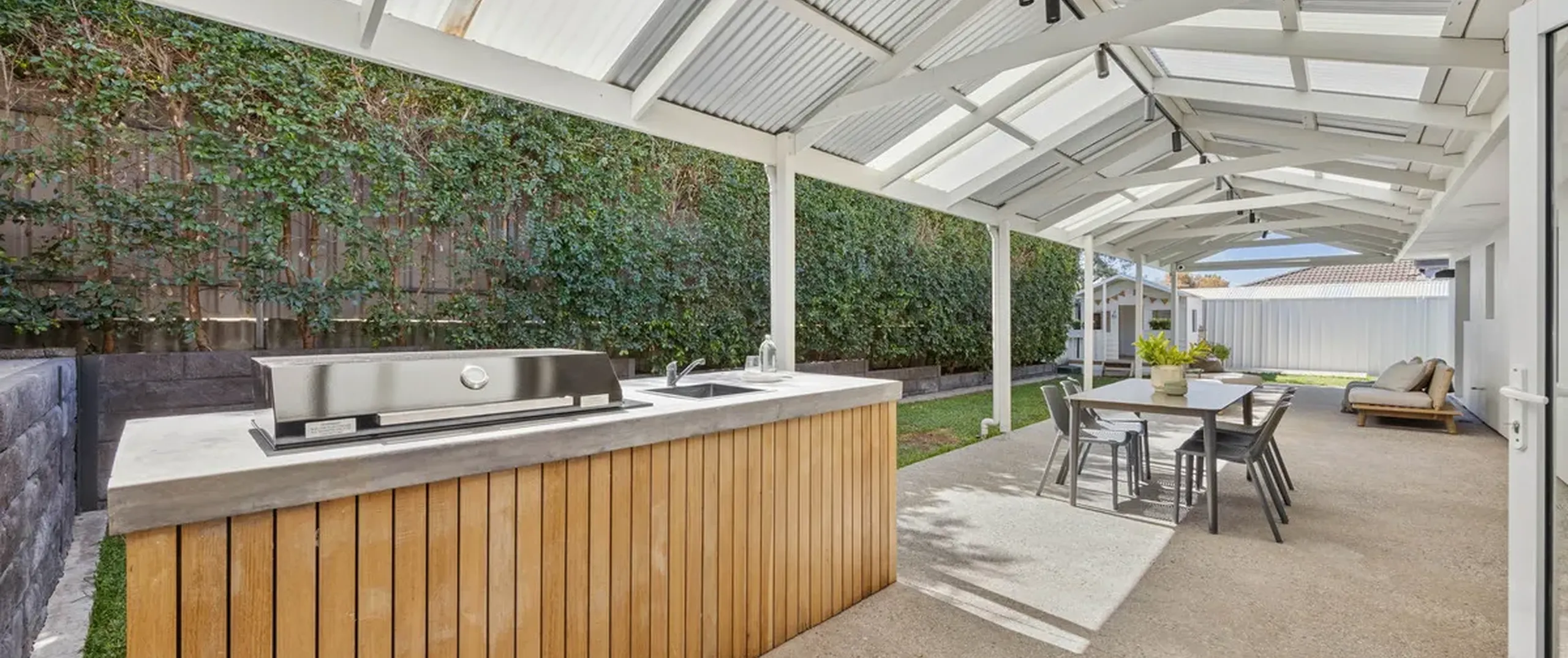 - Outdoor entertaining features outdoor kitchen with BBQ and bar fridge, outdoor speakers, track lighting, and TV connection