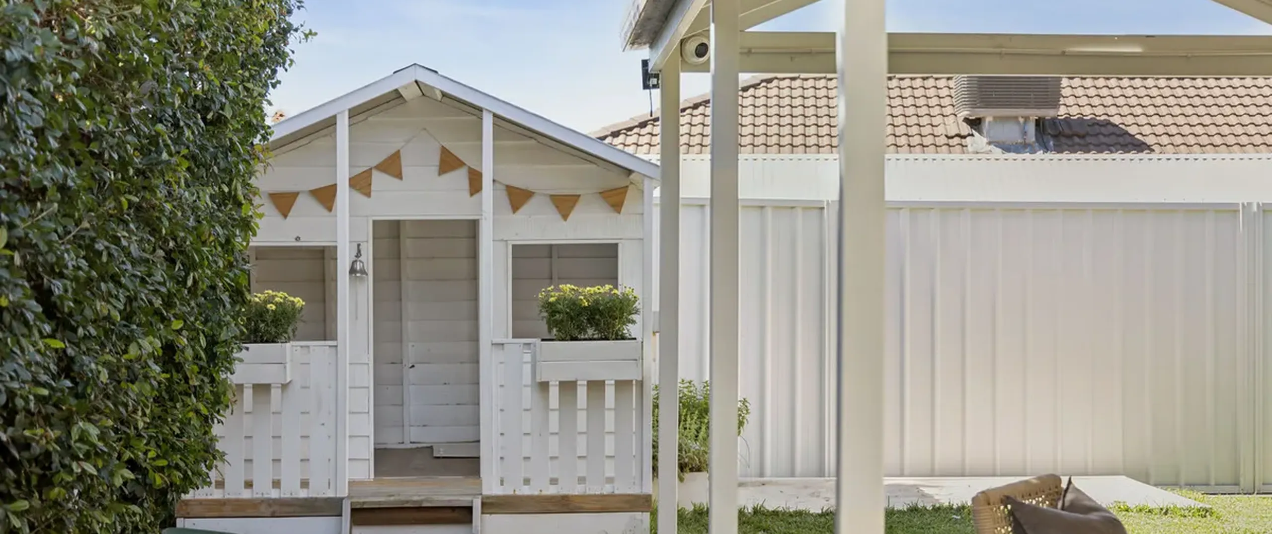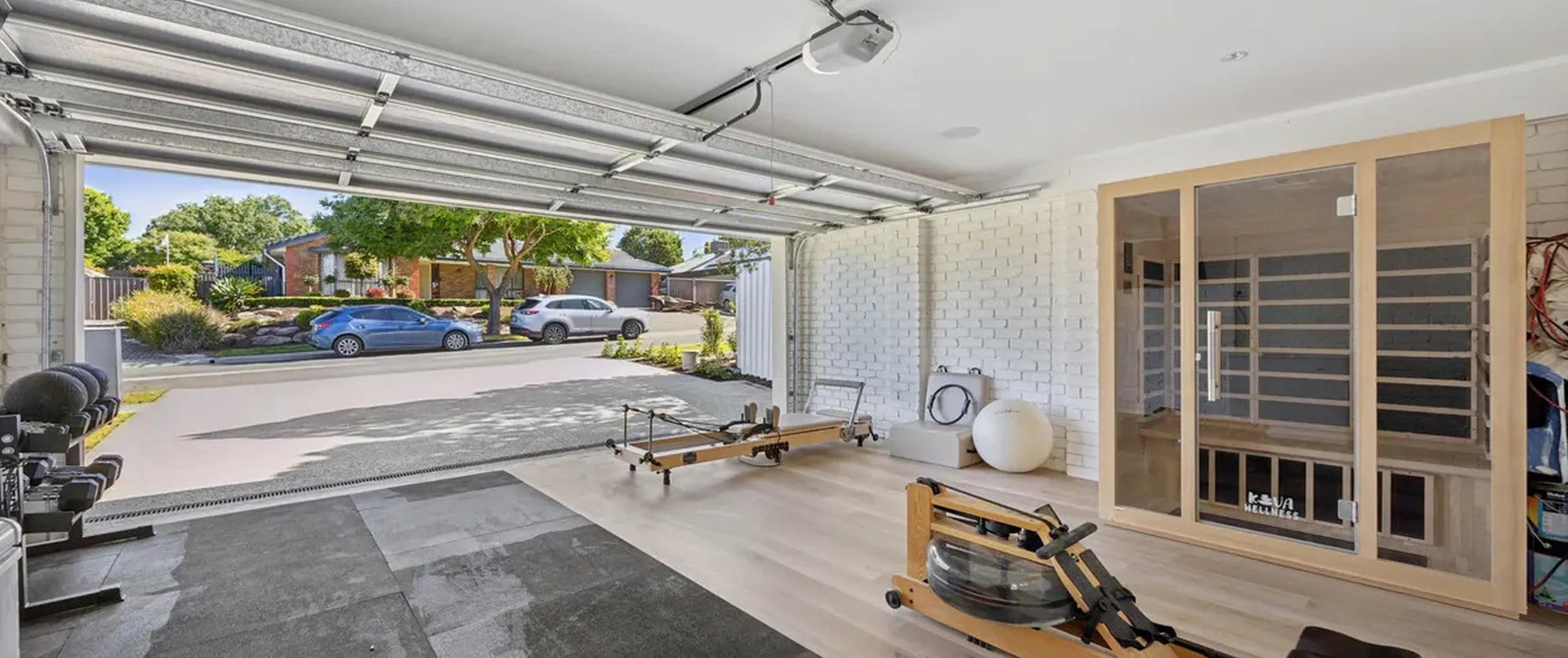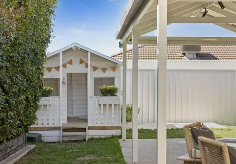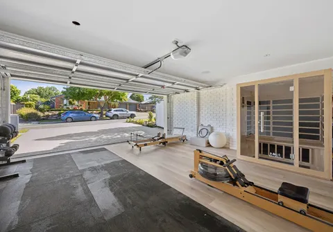 Stepping outside, bi-fold doors reveal an expansive outdoor entertaining area with exposed aggregate concrete, BBQ with bar fridge, outdoor TV and speakers, track lighting, and lush irrigated lawns surrounded by manicured hedges. A cubby house provides endless fun for children, while the secure double garage with automatic panel lift door has been converted for use as a home gym.