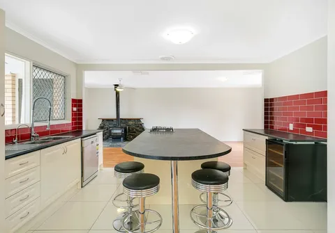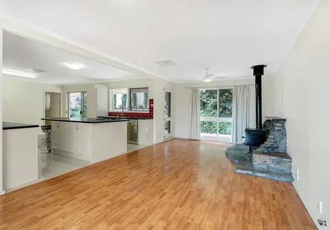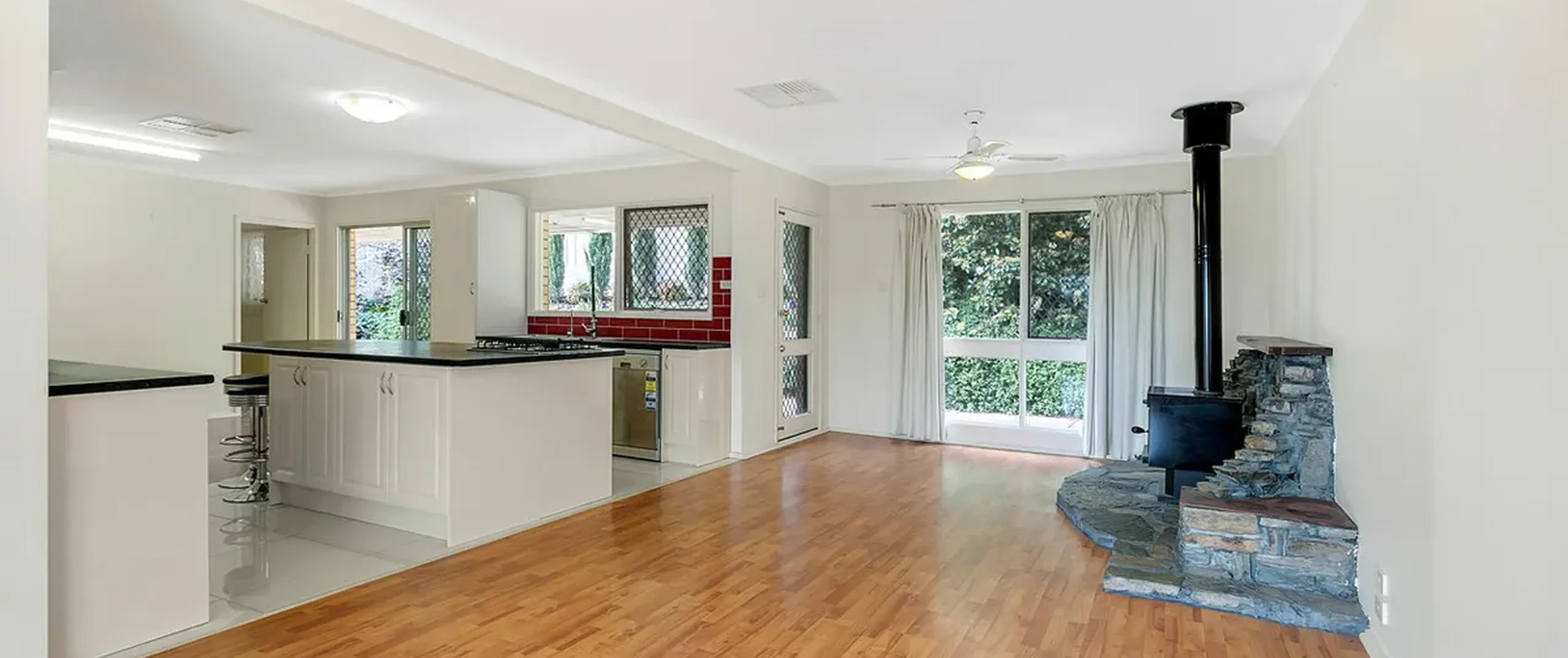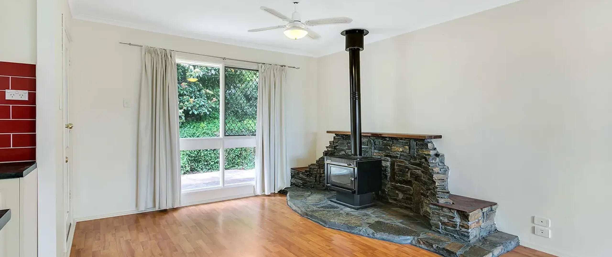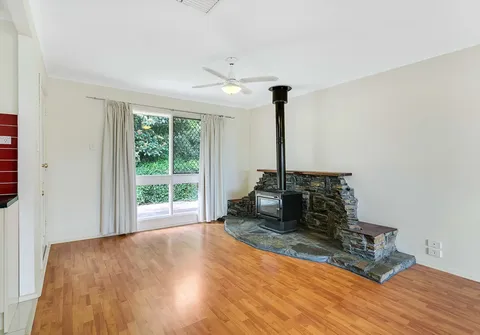 - Spacious, light-filled open plan living area with ceiling fan and combustion heater