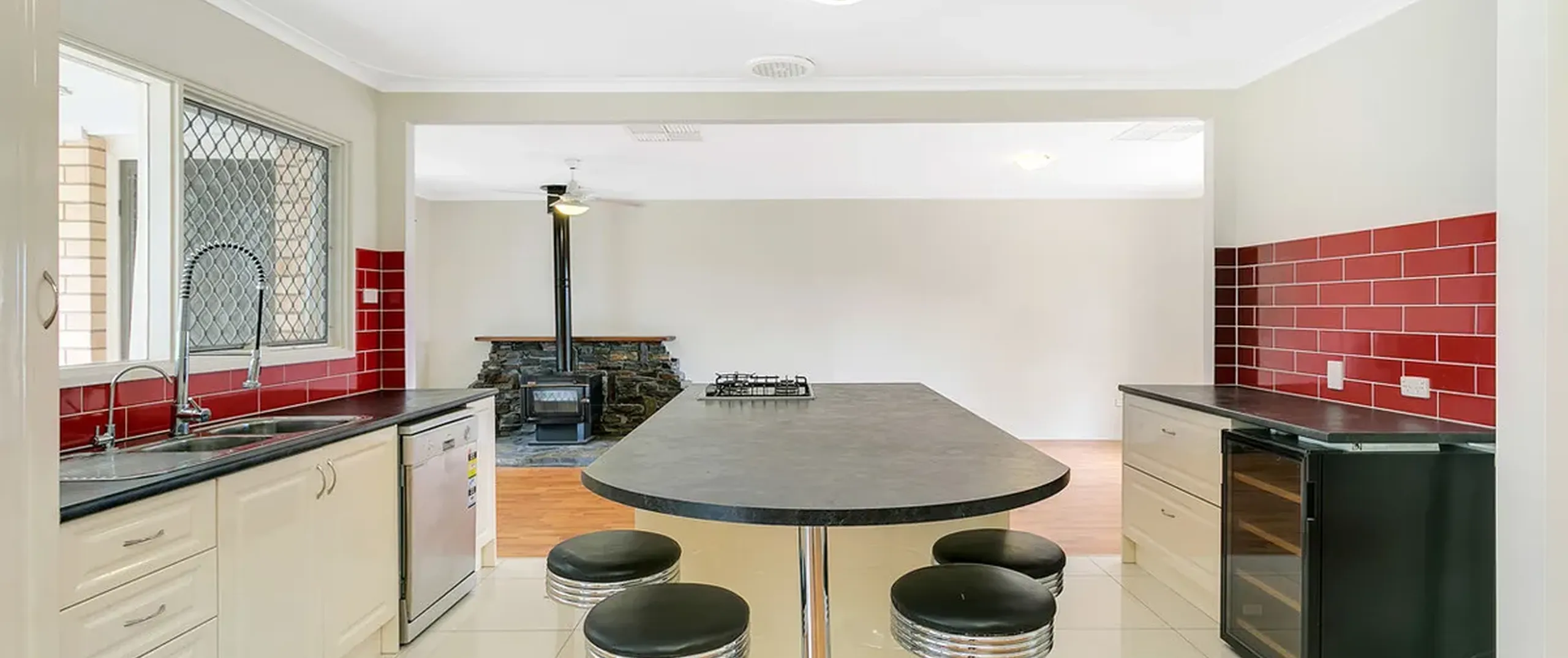 - Modern kitchen with gas cooktop, dishwasher and breakfast bar