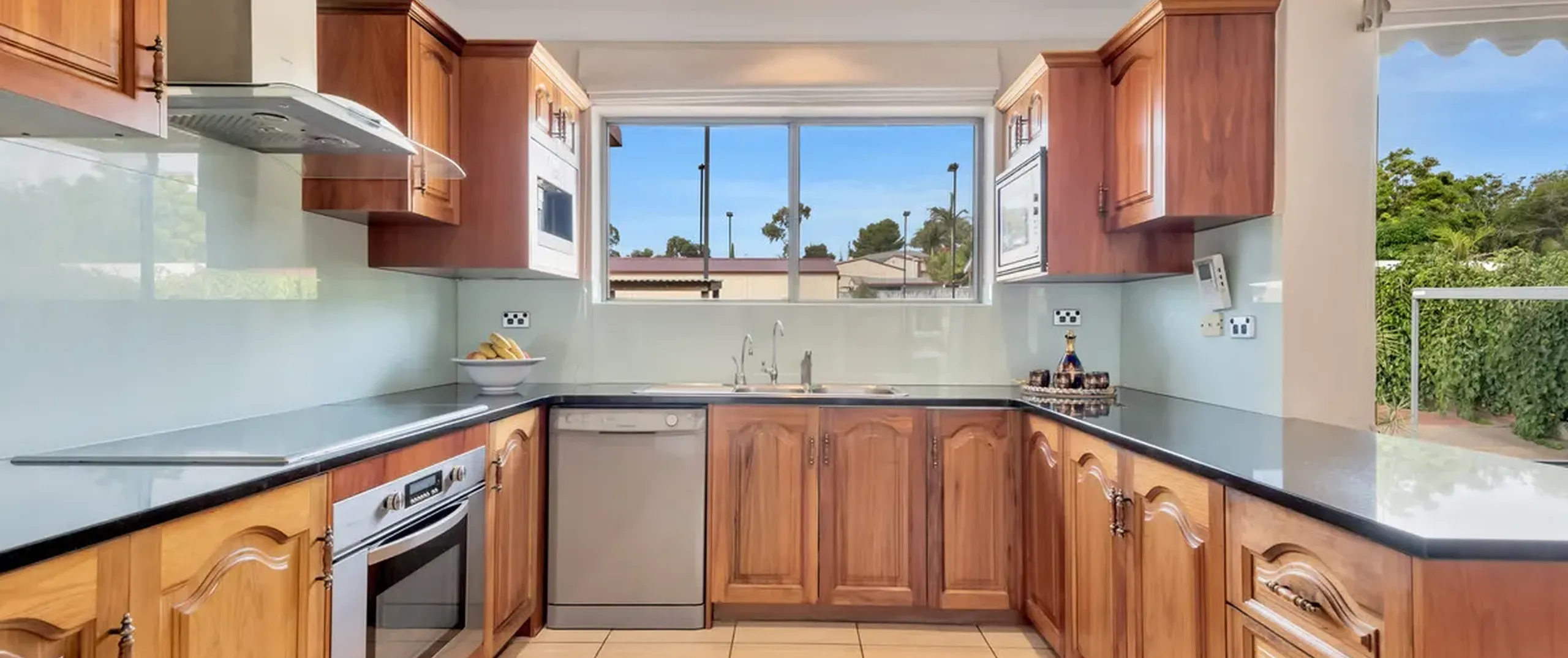- Timber kitchen with stainless steel appliances, ample bench and cupboard space and walk-in pantry