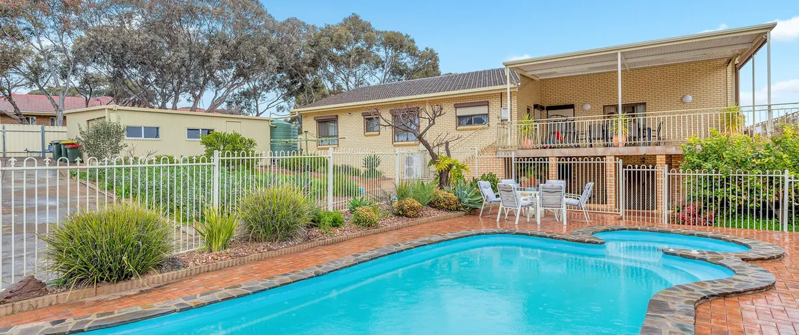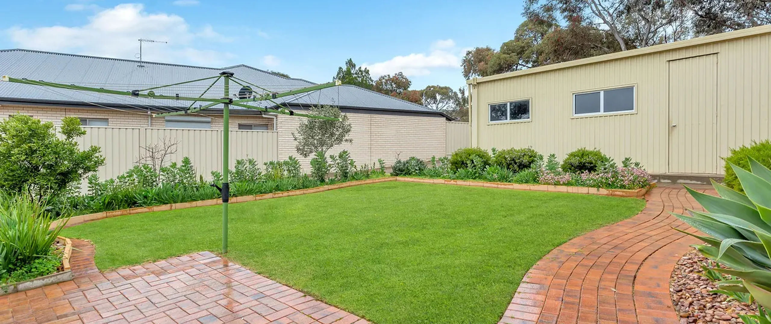 - Secure rear yard with manicured gardens