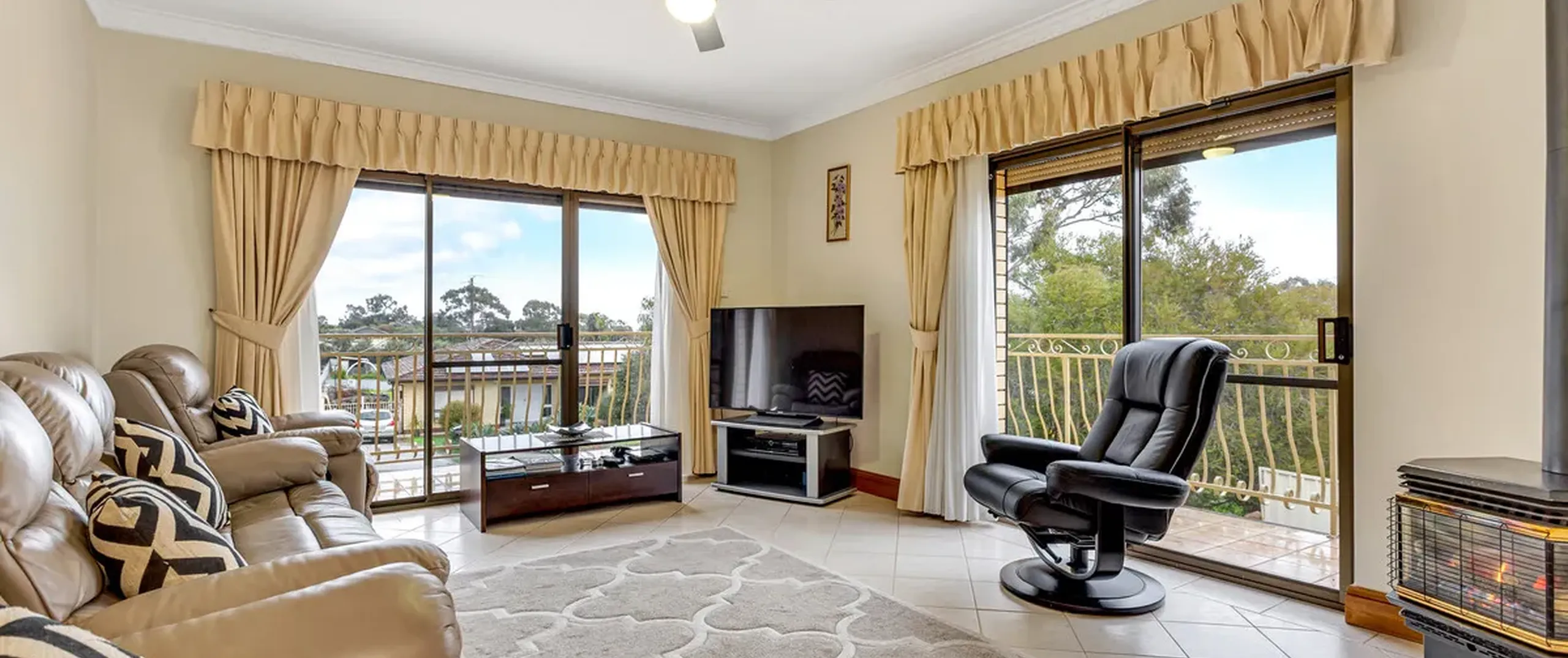 - Light filled family room with ceiling fan, open fire place and balcony access