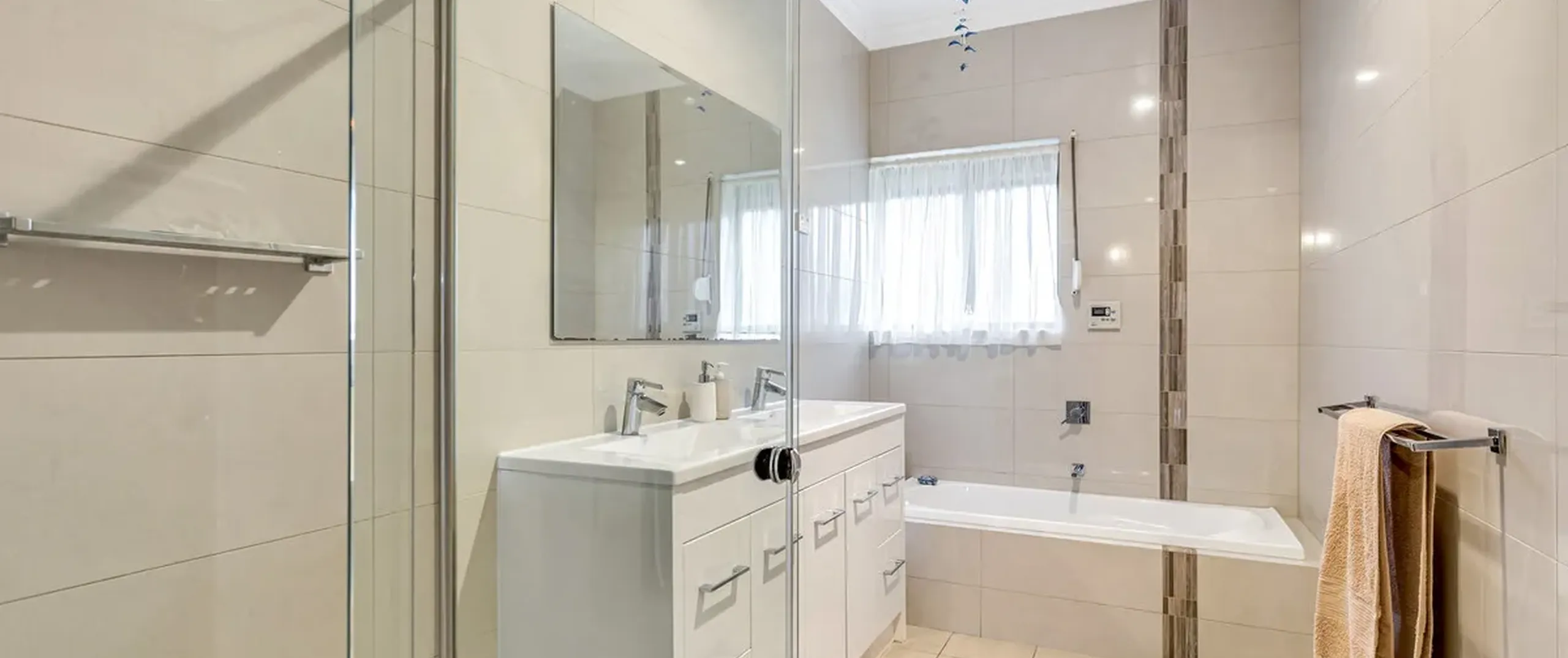 - Modern main bathroom with double basin, full height tiling, tiled surround to bath and feature mosaic tiles