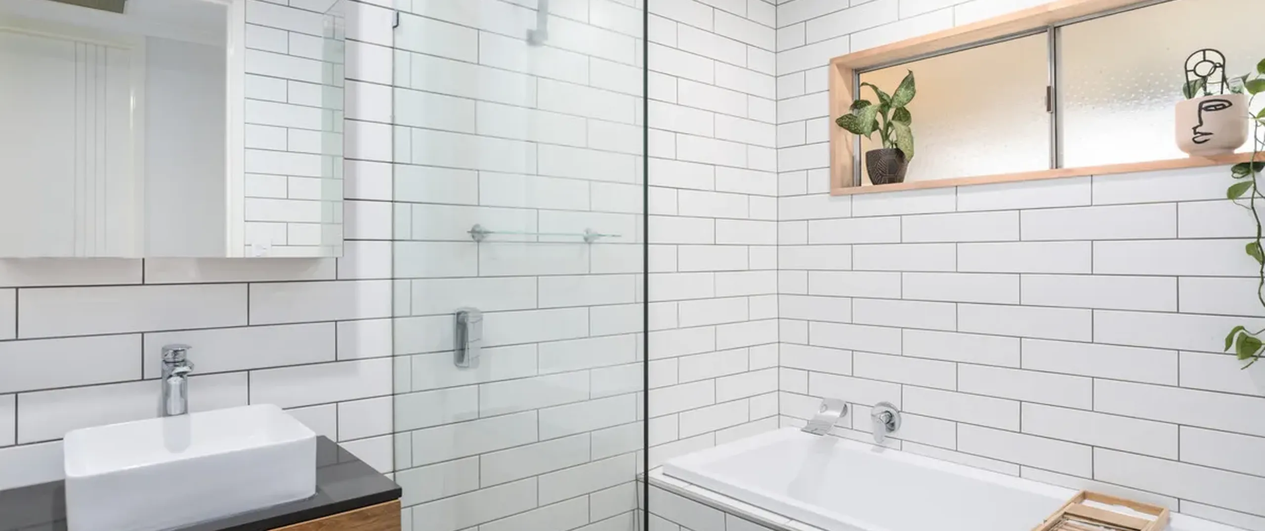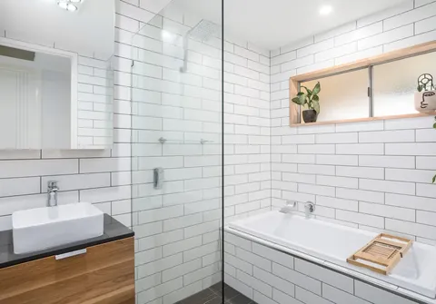 - Stylish bathroom with floor to ceiling subway tiles, bath and separate shower