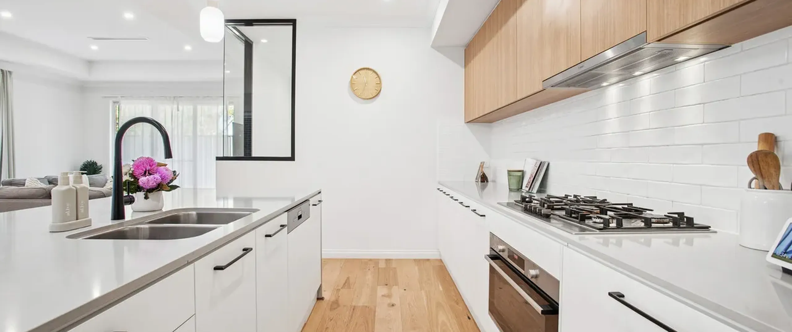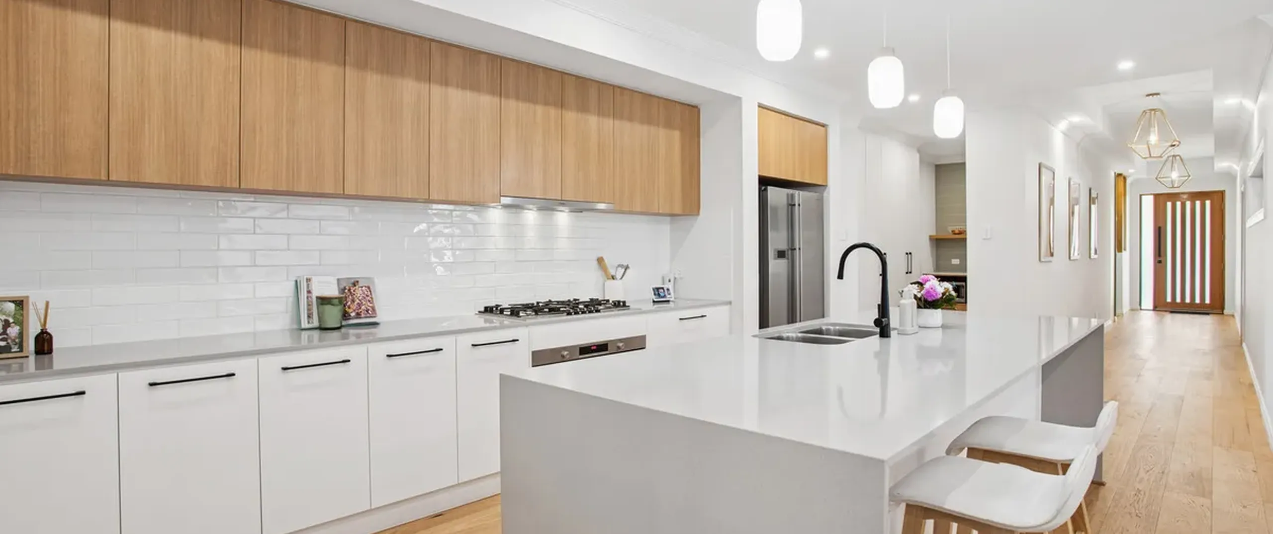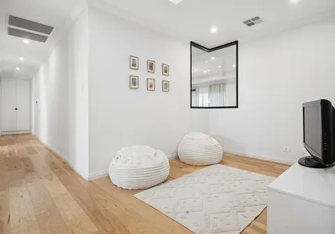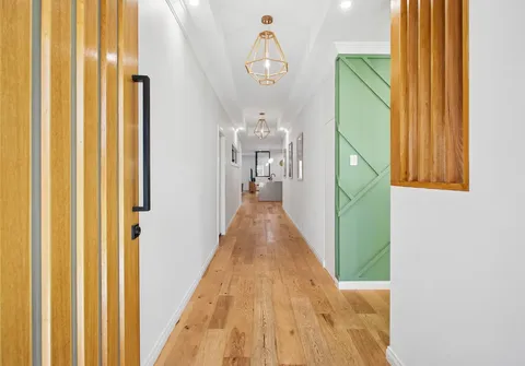 Step inside to discover a breathtaking entryway, where an open hallway, striking 2.7m ceilings and engineered American hickory flooring establish an immediate sense of comfort and refined style throughout this welcoming haven.
