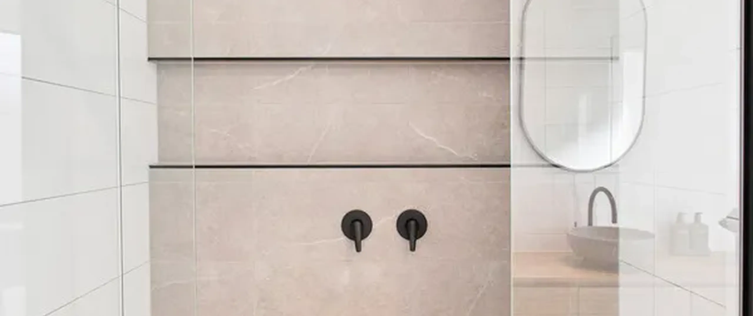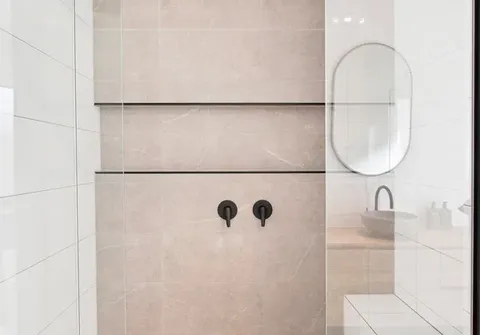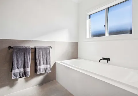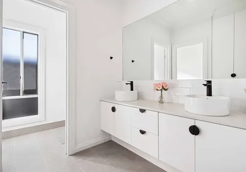 - Master suite with ceiling fan, huge walk-in robe and luxury ensuite with floor to ceiling tiling, dual above counter basins, matte black tapware, oversized shower featuring dual showerheads, niche and built-in bench and separate toilet for convenience
