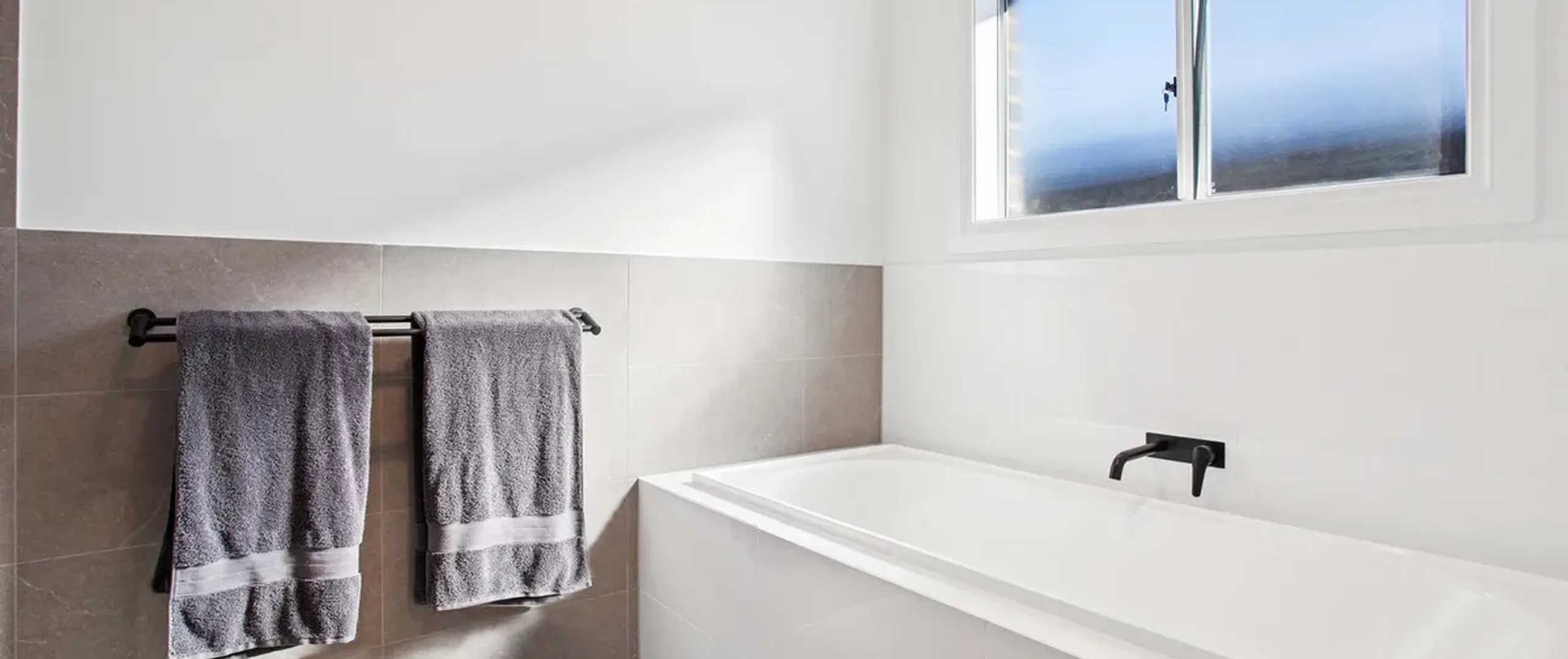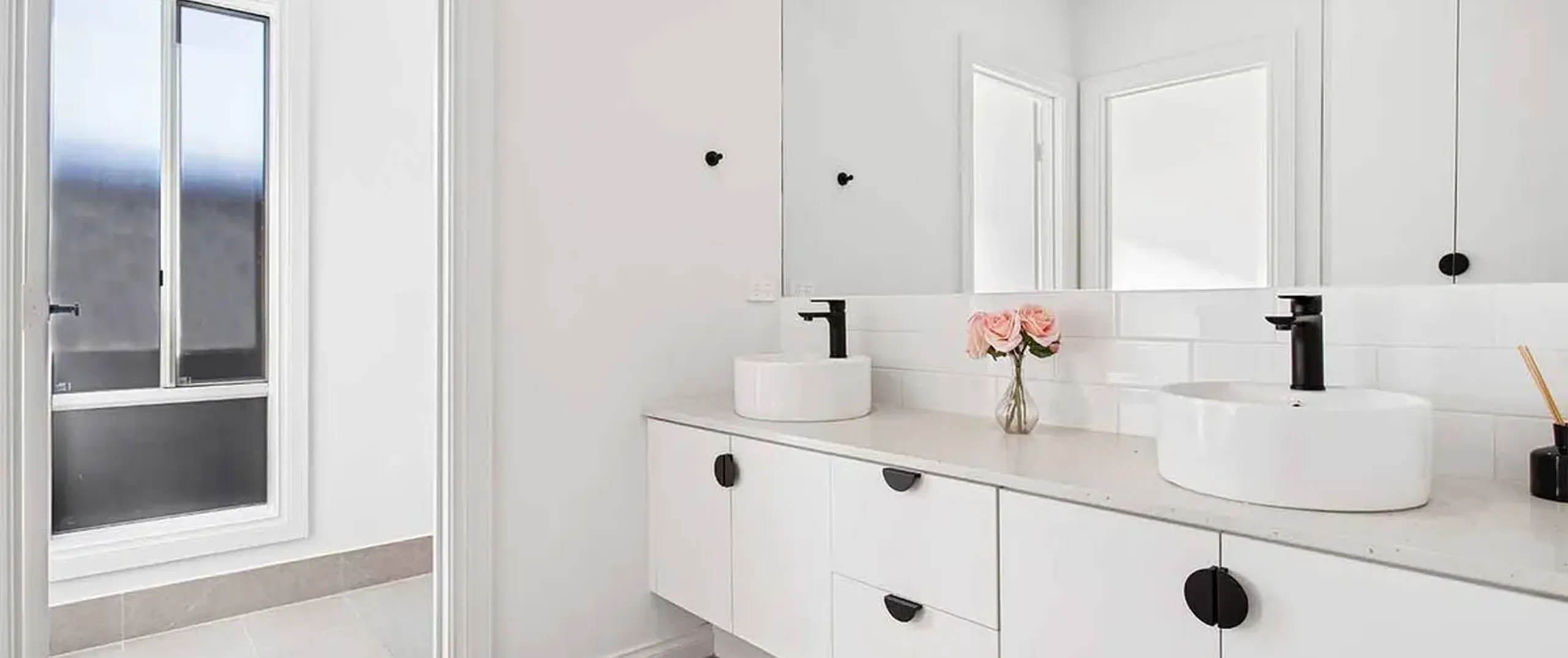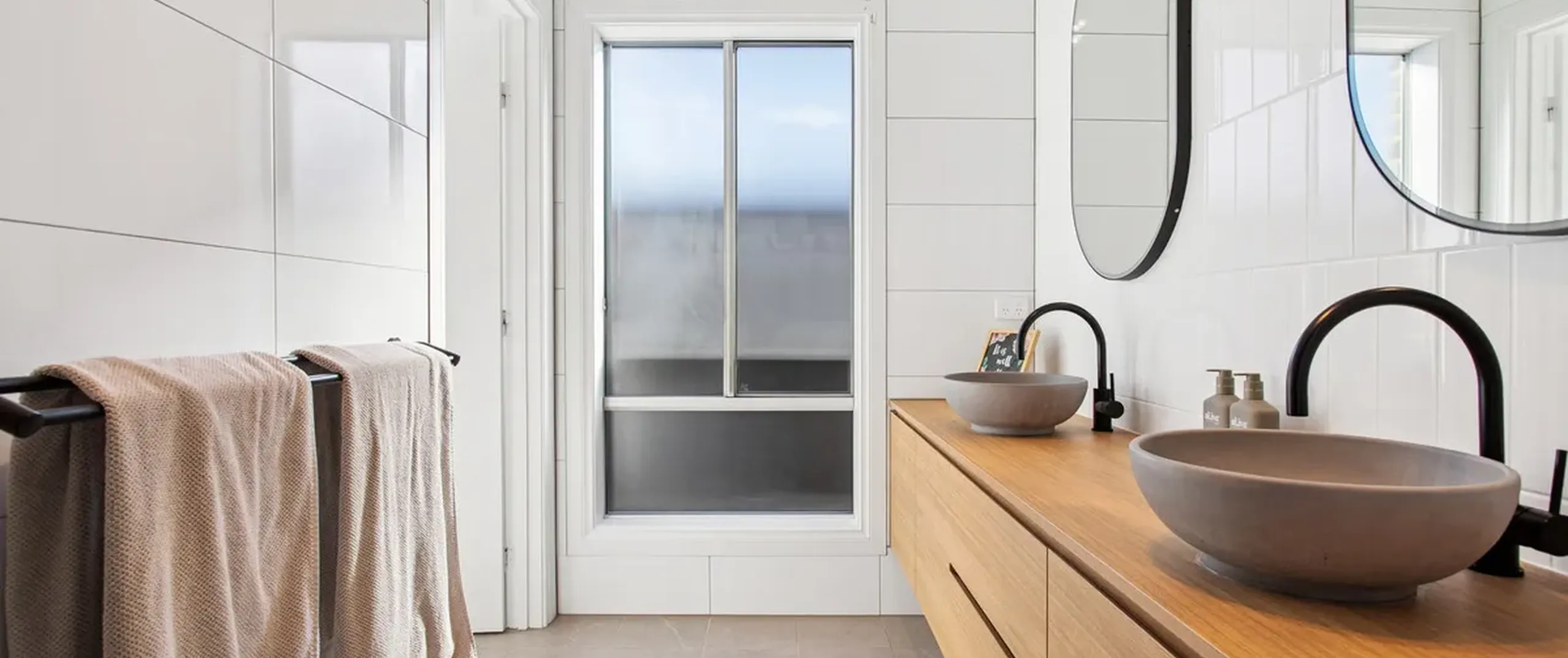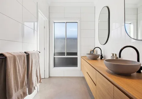 - Contemporary three-way main bathroom with bath, oversized shower, dual above counter basins, matte black tapware and separate toilet for convenience