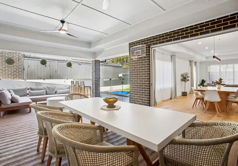 The heart of the home delivers a divine open-plan family, dining and kitchen area, featuring an abundant of windows that flood the space with natural light, coffered ceiling, gorgeous feature pendant lighting and 20KW reverse cycle air conditioner ensuring comfort all year round. Bifold sliding doors open to the decked outdoor entertaining area, creating a seamless flow between indoor and outdoor living. This inviting space equipped with two ceiling fans is ideal for hosting guests or enjoying quality time with family. Overlooking the sparkling heated swimming pool and spa, it sets the scene for effortless, stylish entertaining in any season.