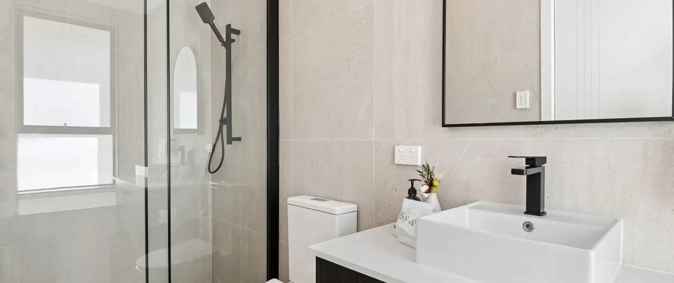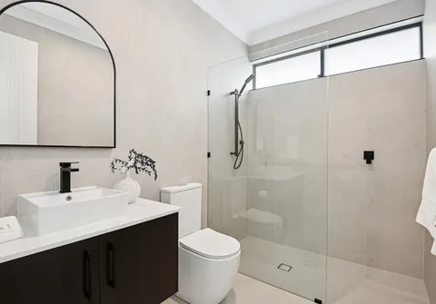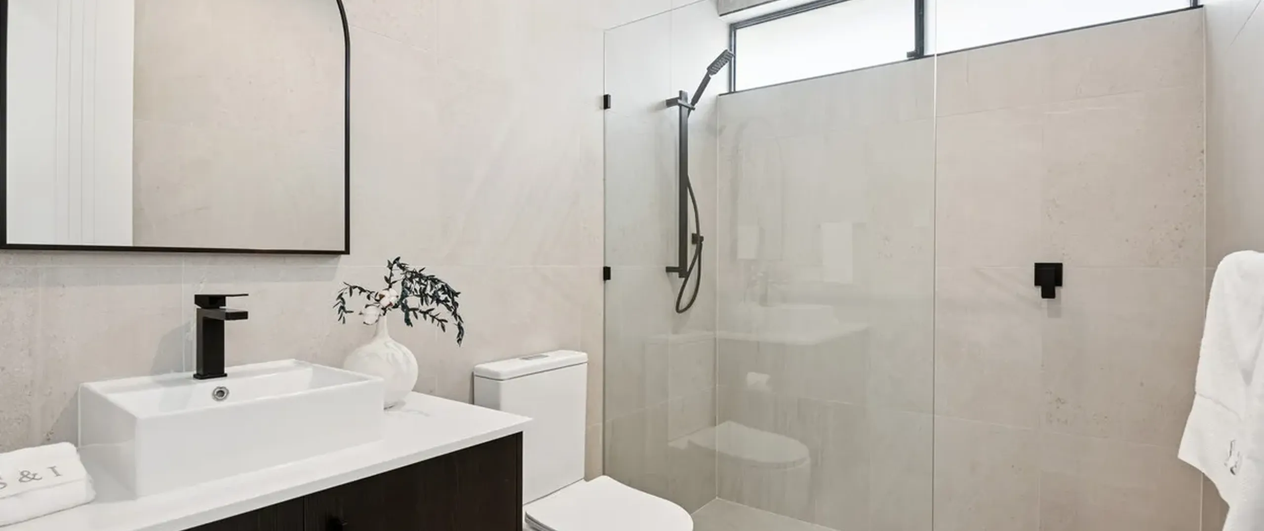 - Stylish main bathroom with oversized shower, toilet and floor to ceiling tiles