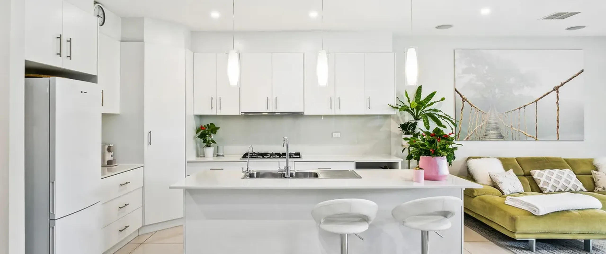- Sleek white kitchen boasting stainless steel appliances including dishwasher, gas cooktop and oven plus spacious pantry and 3m island bench with breakfast bar