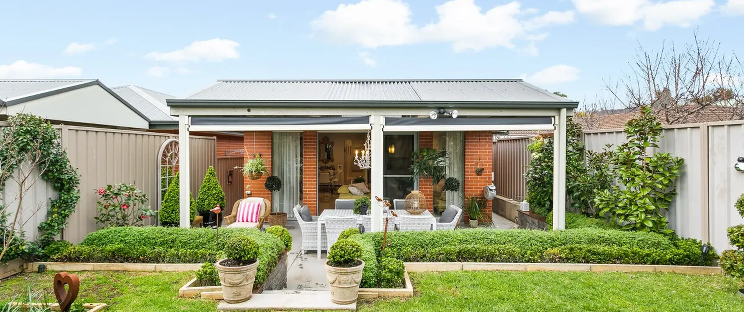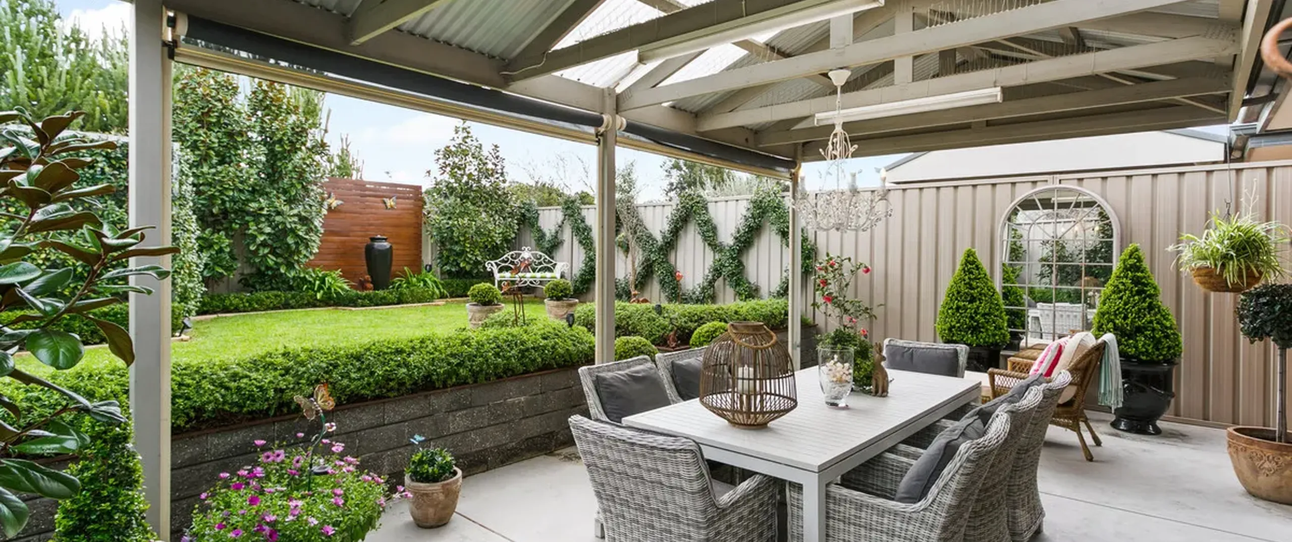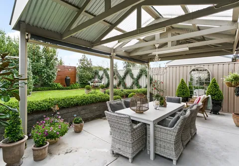 - Large outdoor entertaining area with pitched roof pergola and café blind, providing a space for year-round entertaining