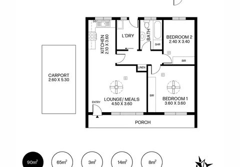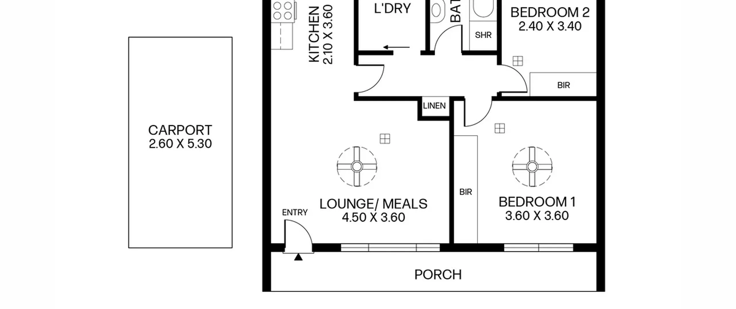 The layout offers two bedrooms and one bathroom as well as a light-filled lounge and meals area that leads into the kitchen. Here, gas appliances and ample storage await while a laundry and a linen cupboard complete the floorplan.