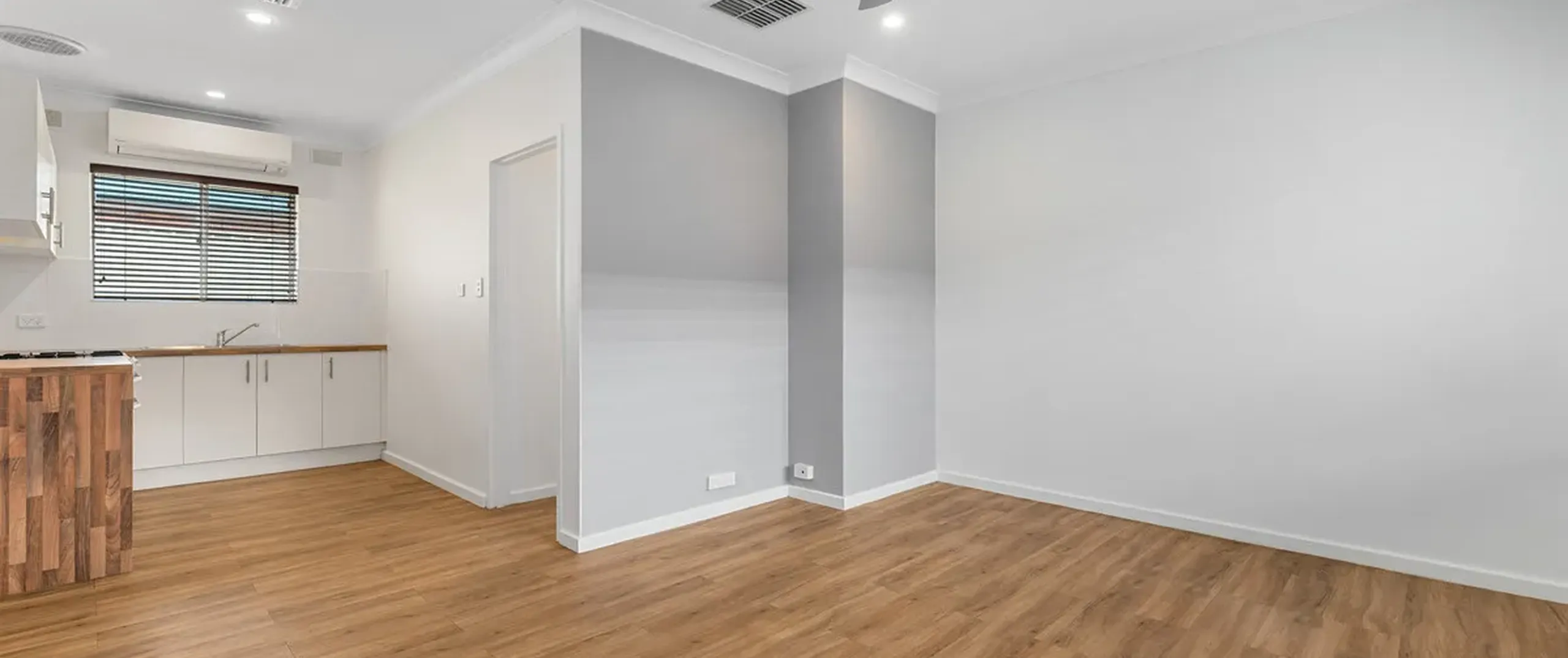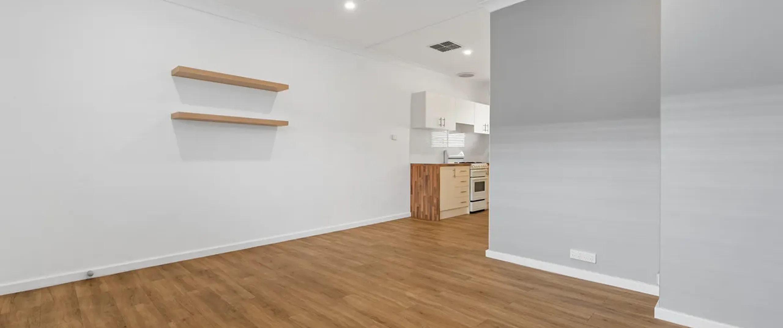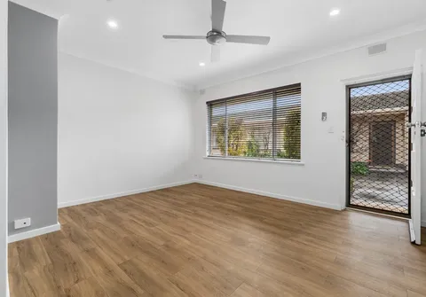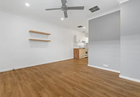 - Open plan lounge/meals area with easy-care flooring, LED downlights and ceiling fan
