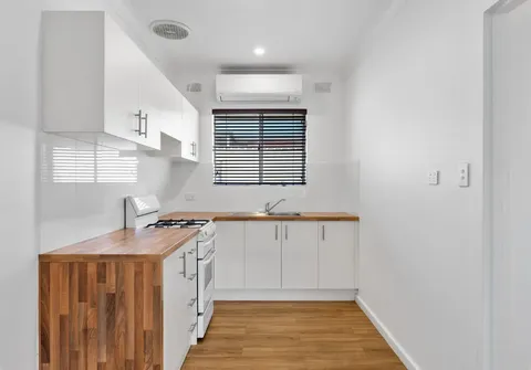 - Practical kitchen with standalone gas cooktop and oven, ample cupboard space and split system air conditioner