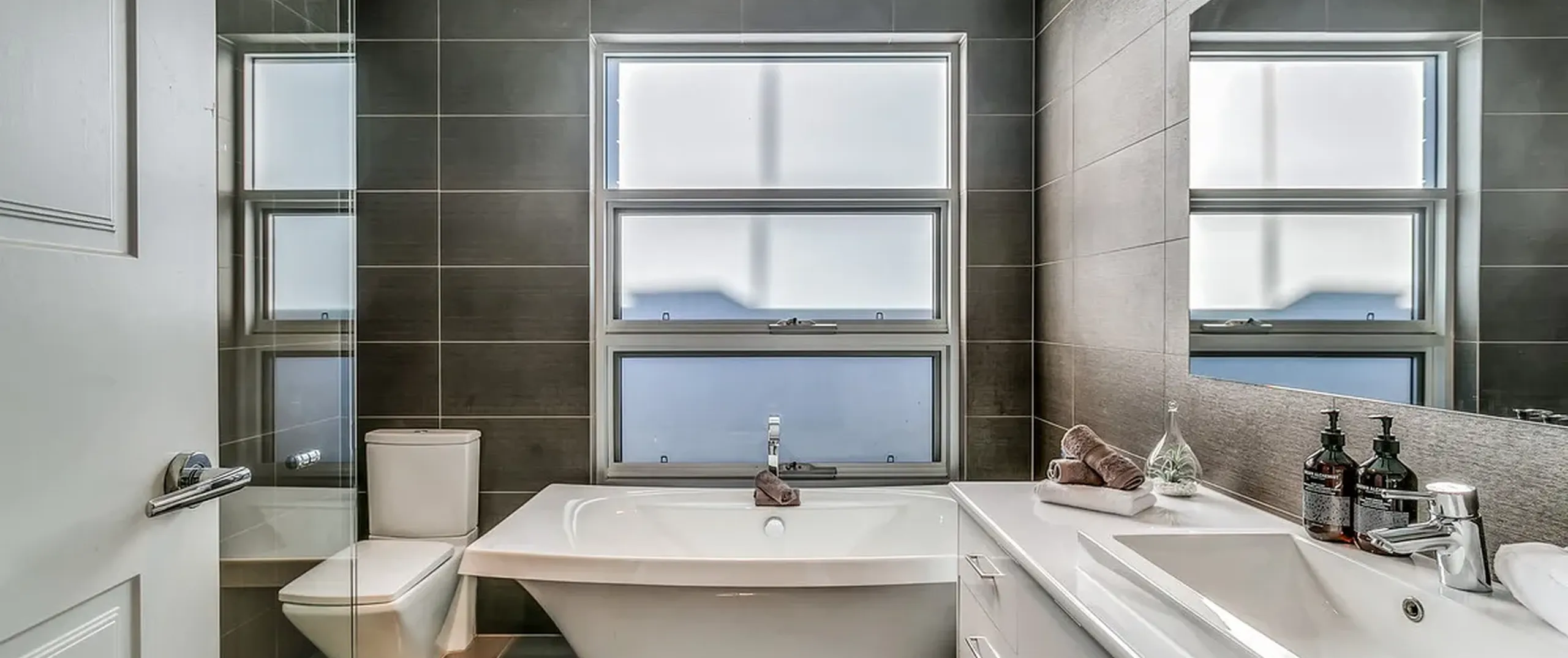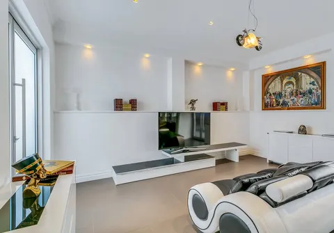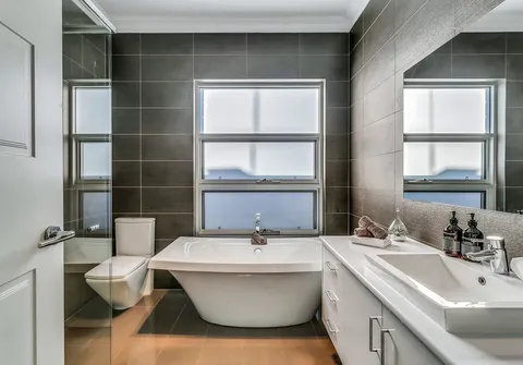 - Immaculate bathroom with floor-to-ceiling tiles, freestanding bath and separate shower