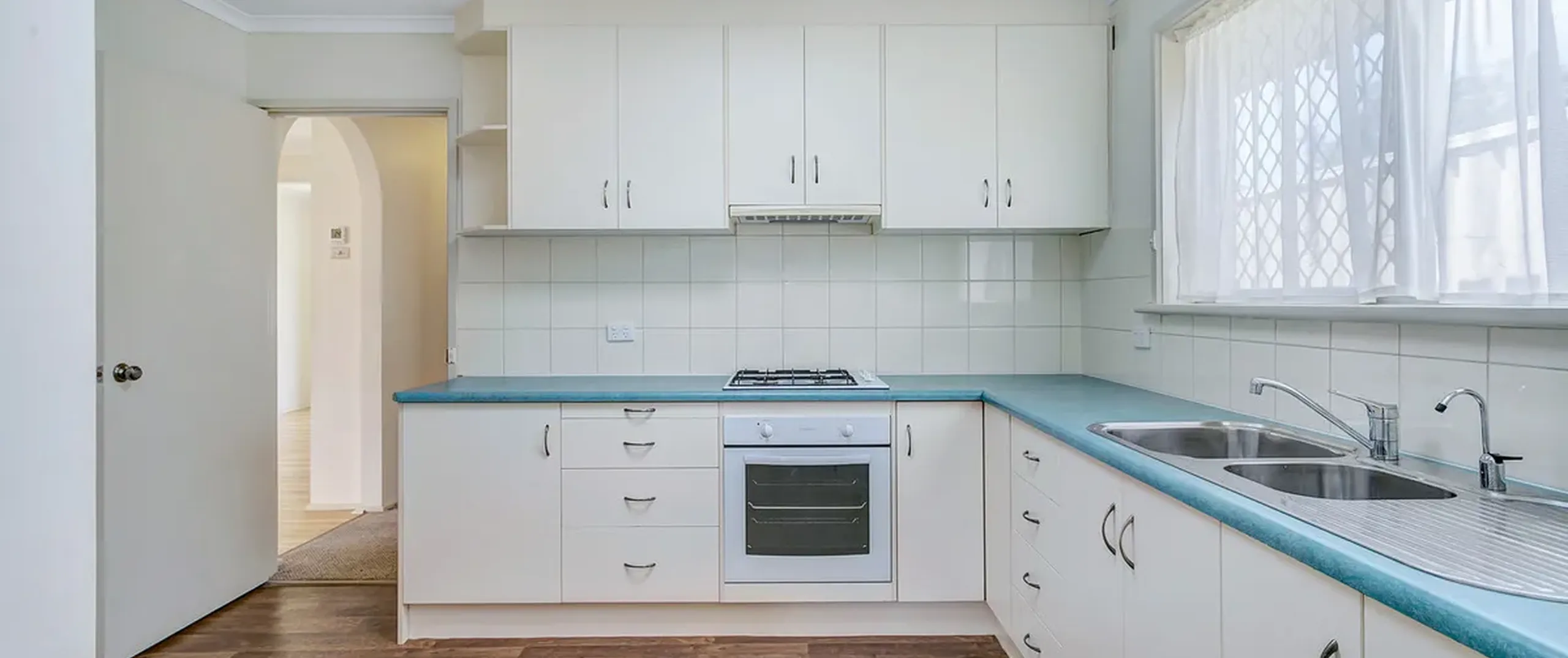 - Functional kitchen with ample bench space and cupboard space and gas cooktop