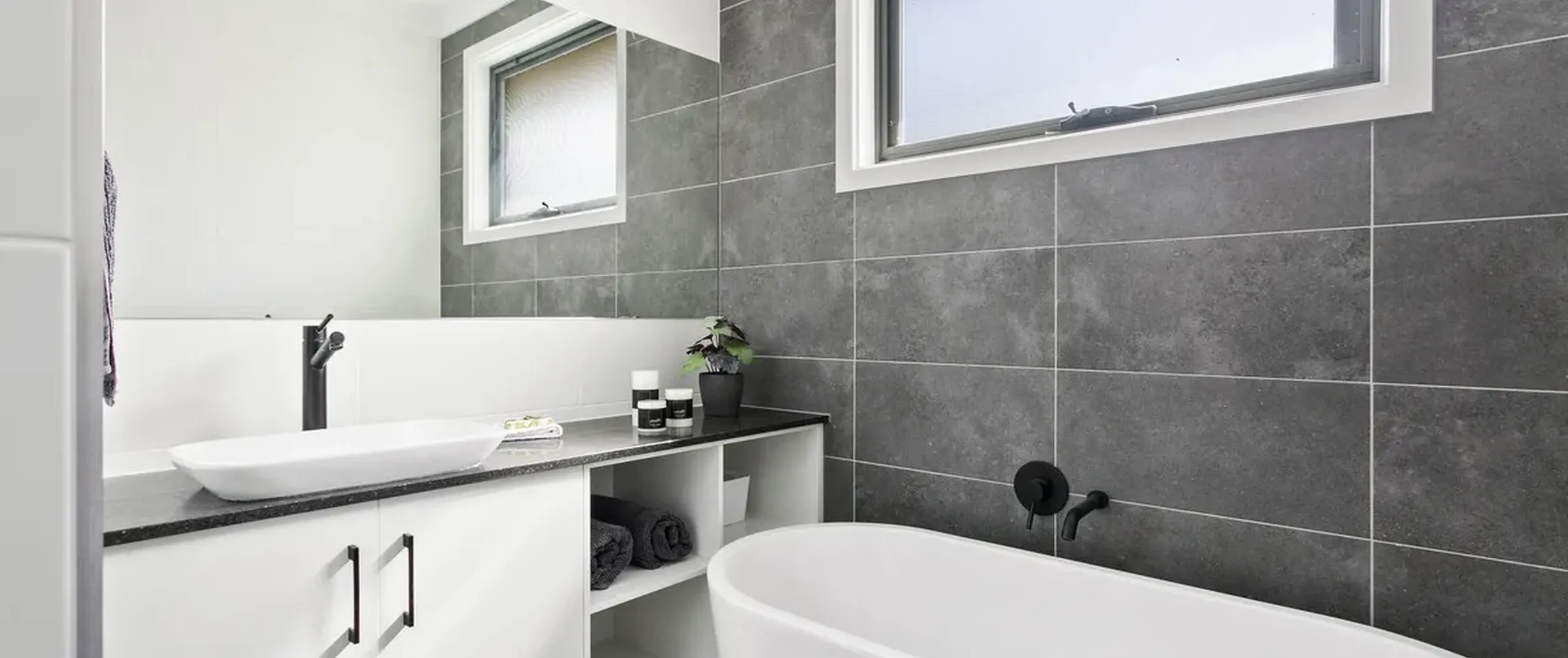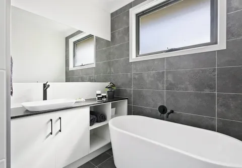 - Modern main bathroom with floor to ceiling tiles, separate shower and free-standing bath