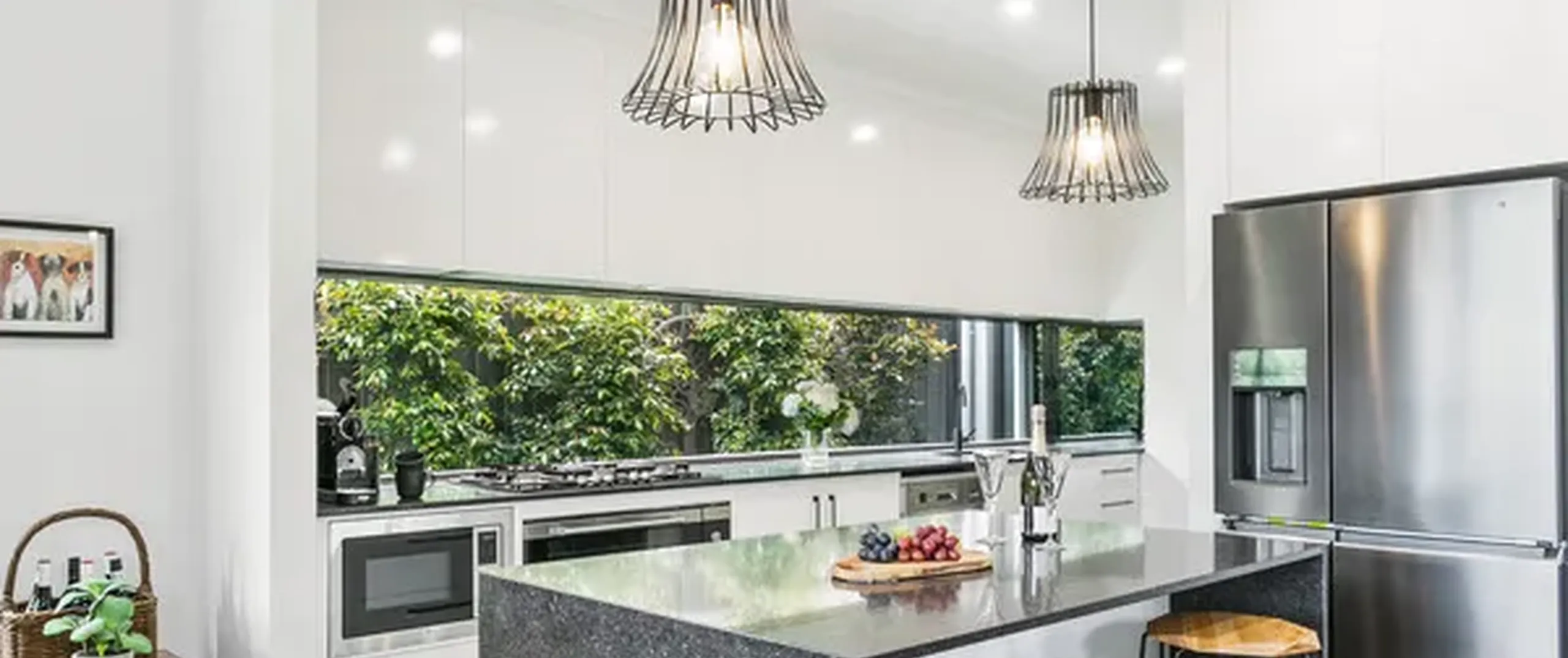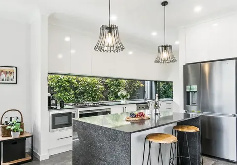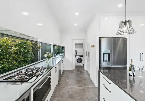 - Stylish kitchen with stainless steel appliances, 900mm gas cooktop, dishwasher, ample bench space, pantry, island boasting stone waterfall benchtop, feature pendant lighting and breakfast bar