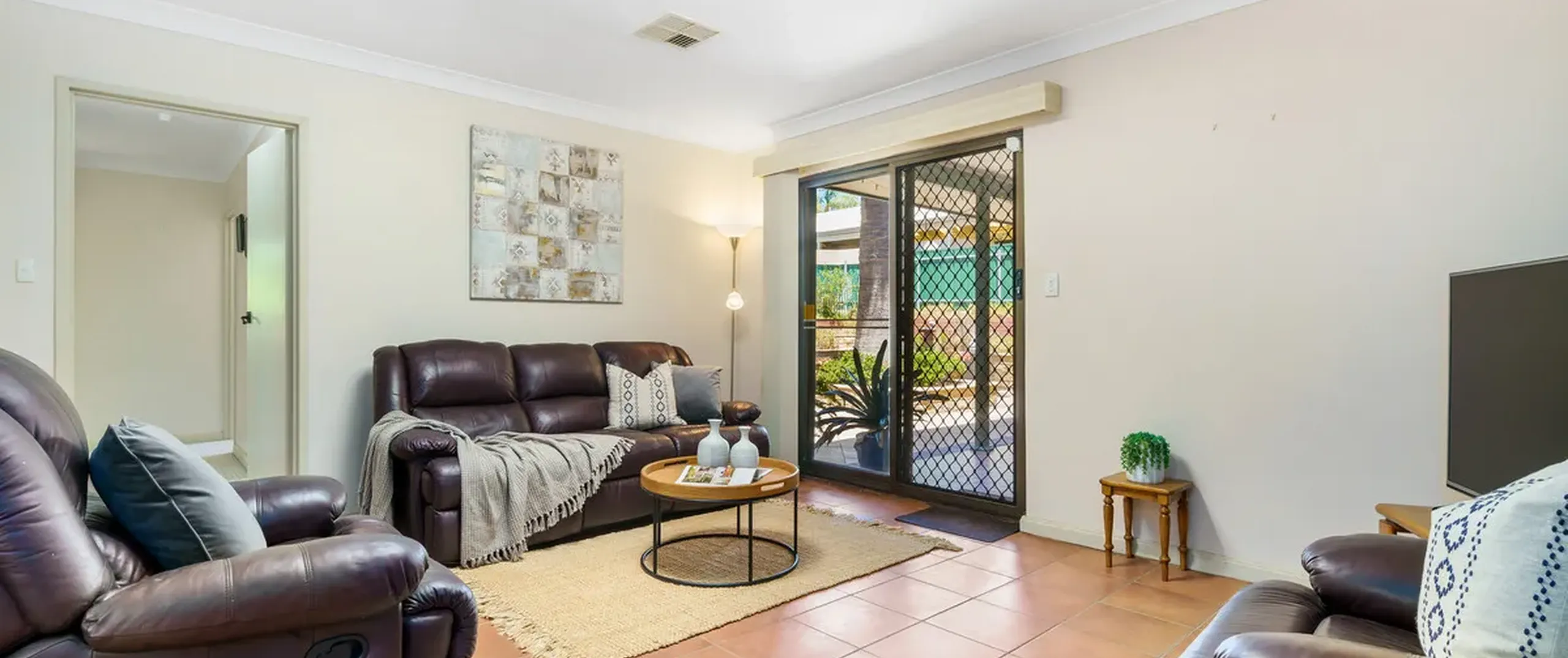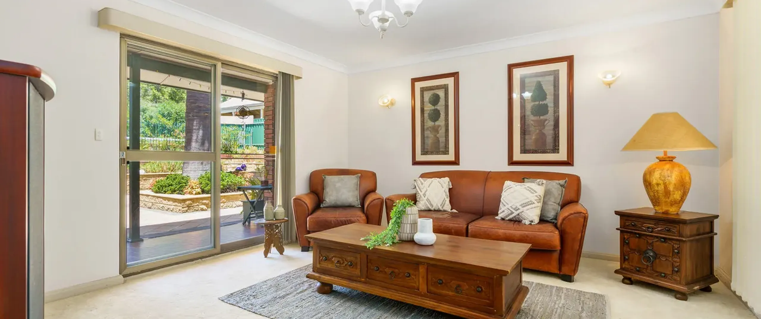 - Light filled living room with sliding door to back porch