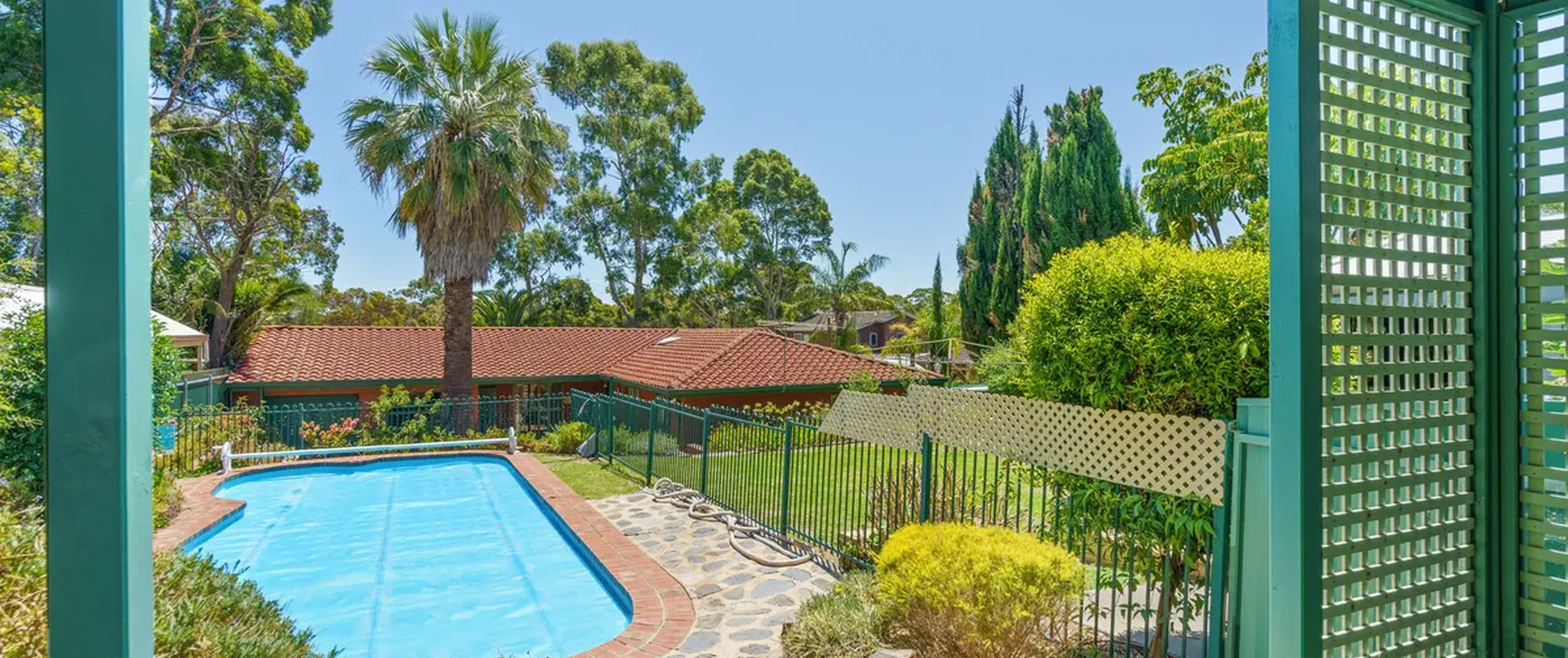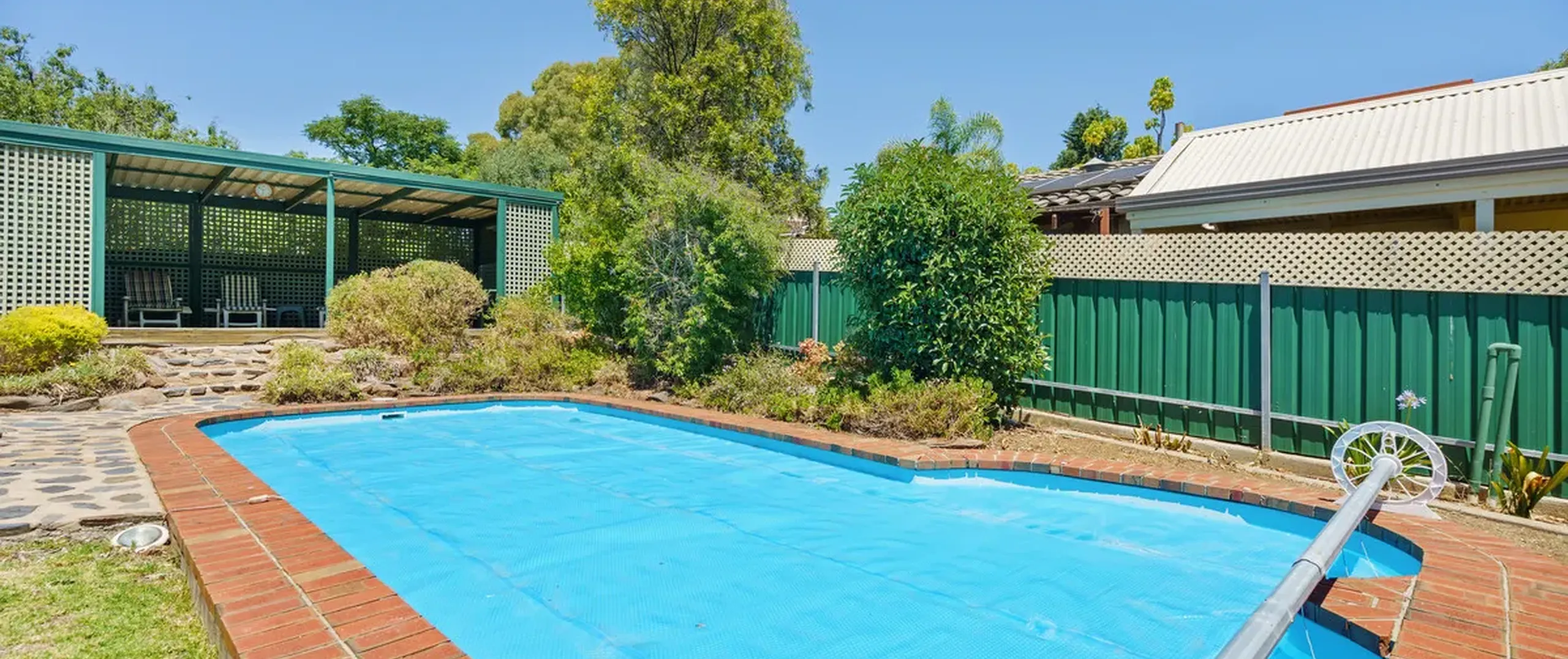 - Shaded entertaining area overlooking a sparkling in-ground swimming pool, providing the perfect space to host family and friends