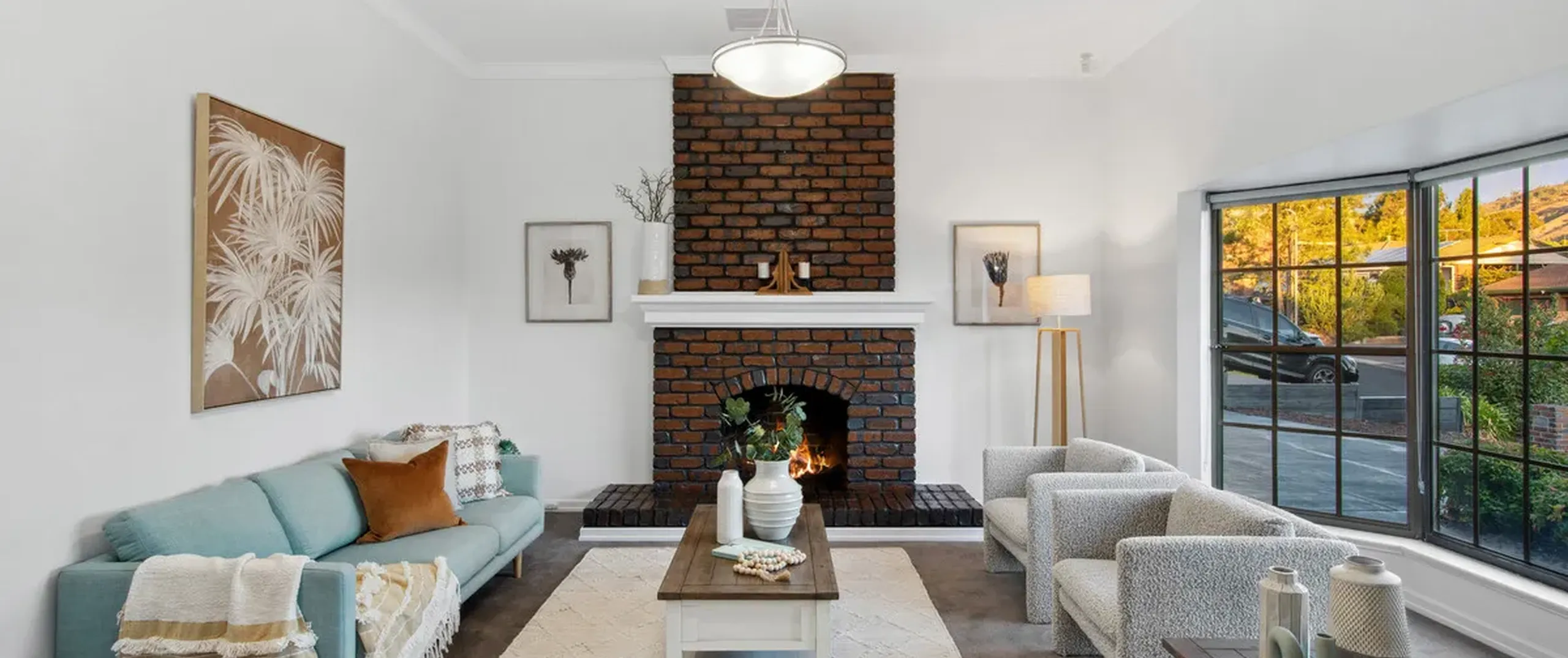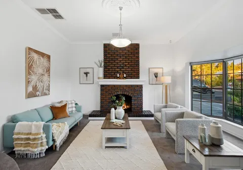 - Large lounge with high ceilings, ornate ceiling rose and cornices, brick-feature fireplace, bay window