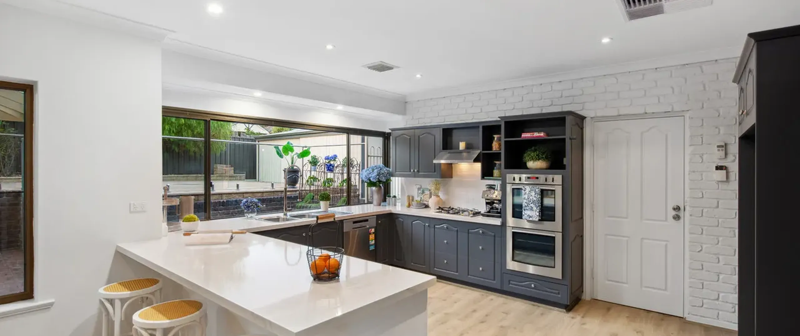 - Family size kitchen with the lot: stainless appliances, dishwasher, gas cooktop, rangehood, double electric oven